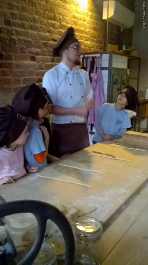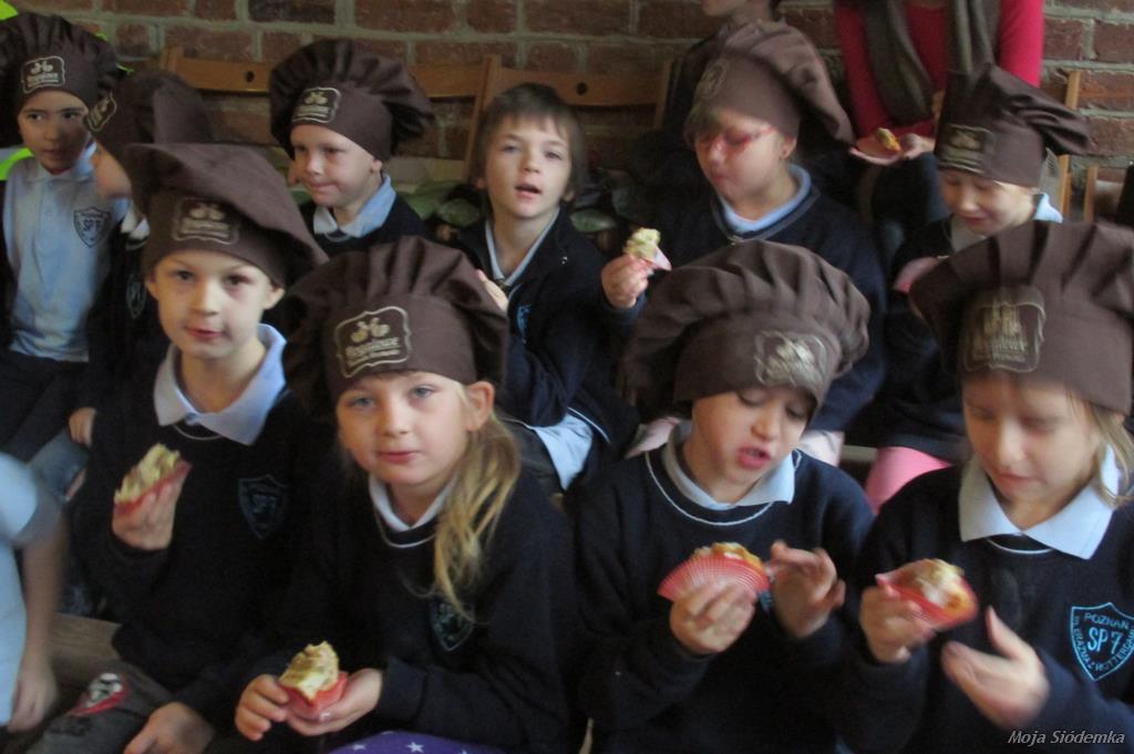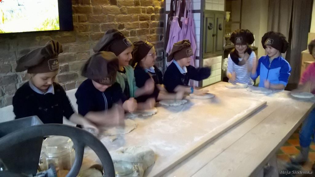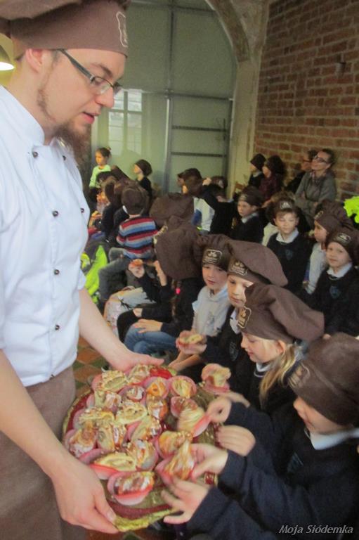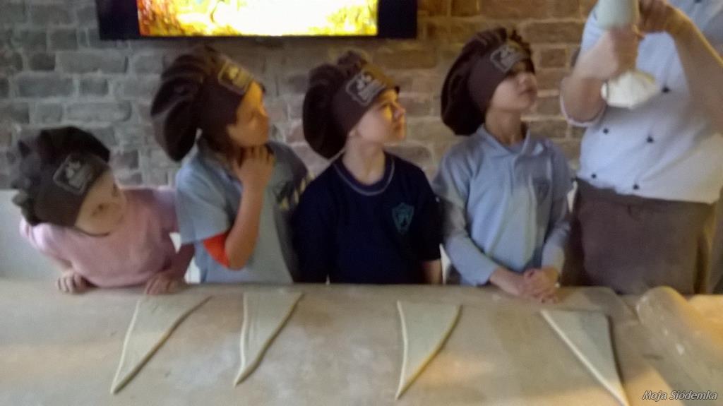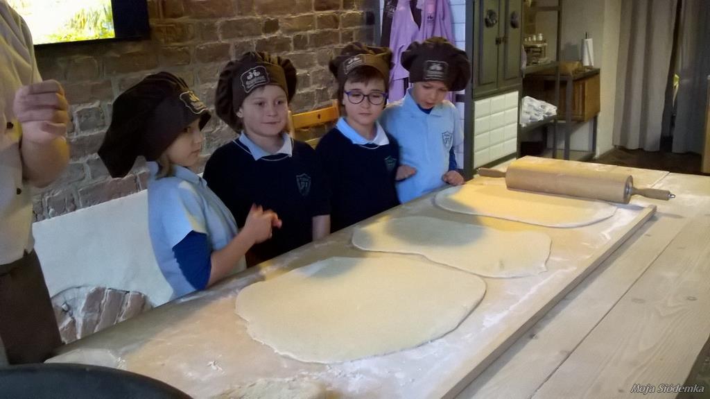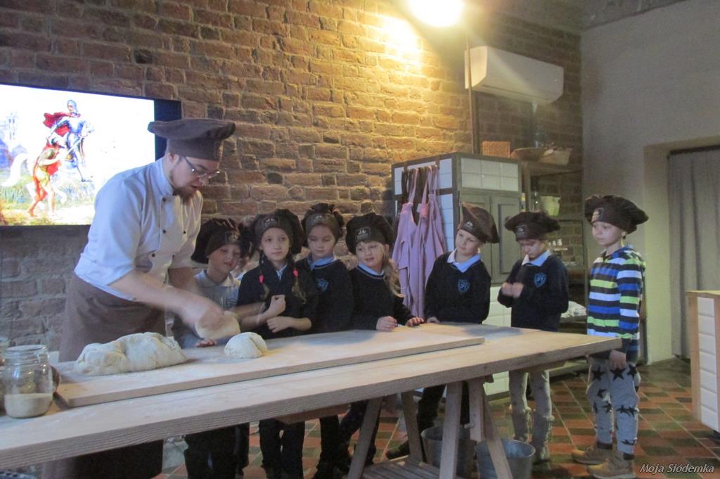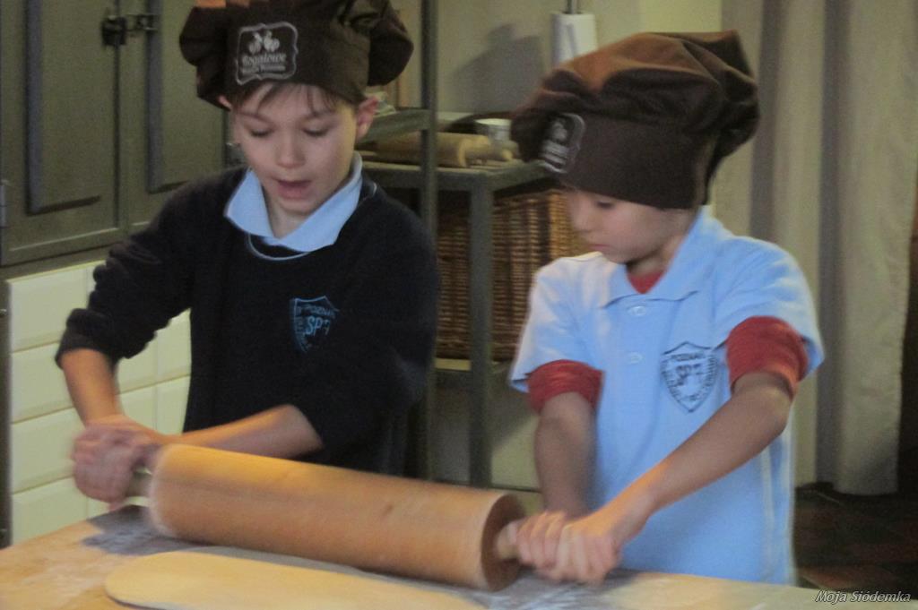 Uczniowie Siódemki zapragnęli zobaczyć, jak powstają tradycyjne rogale świętomarcińskie. Przed bramą muzeum czekała na nas pani w fartuchu, a piękny zapach zapraszał do środka. Pokaz odbywał się w renesansowej sali – sufit powstał 500 lat temu. Rogalowy Mistrz uczył nas poznańskiej gwary. Wspólnie z Mistrzem wypiekaliśmy rogale przy użyciu tradycyjnych narzędzi. Poznaliśmy recepturę i składniki rogali świętomarcińskich. Obejrzeliśmy też legendę o Marcinie. Na koniec oczywiście nastąpiła degustacja i prezentacja multimedialna o historii naszego miasta. Każdy z nas otrzymał certyfikat rogalowego czeladnika. Było pysznie i zabawnie.