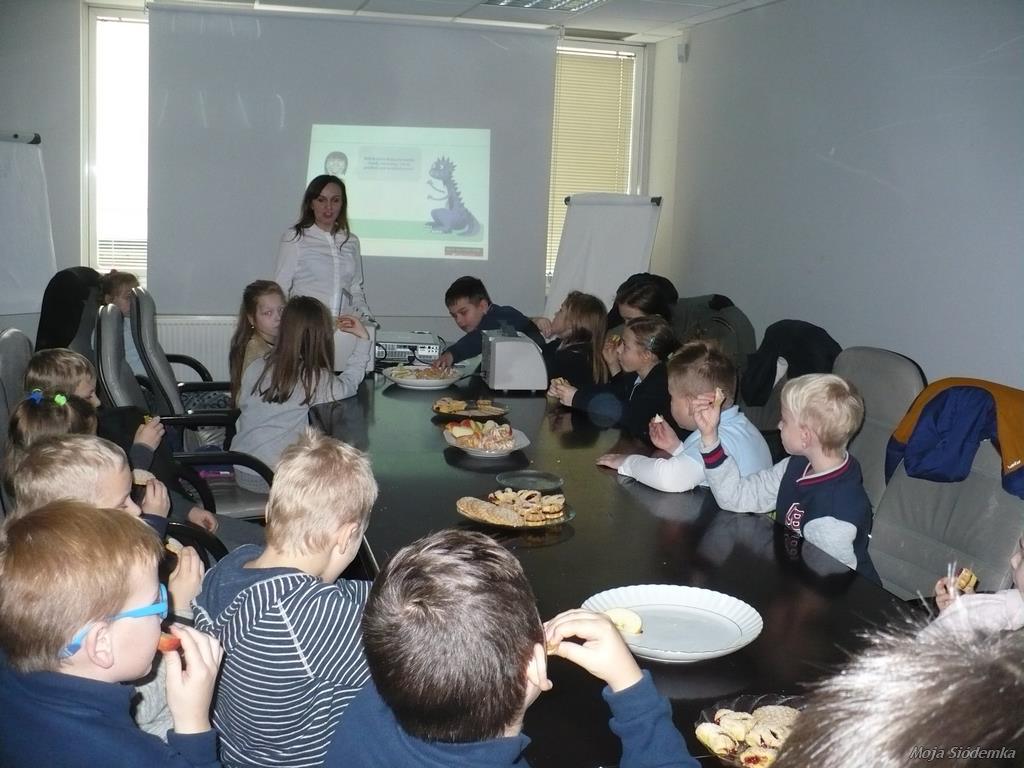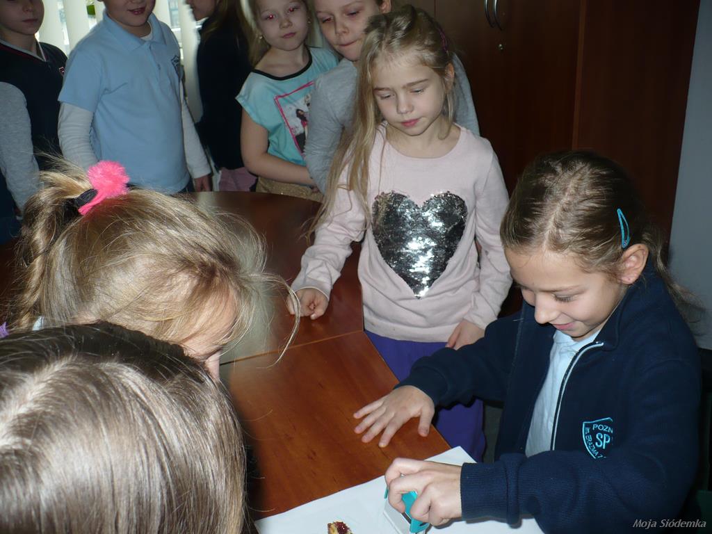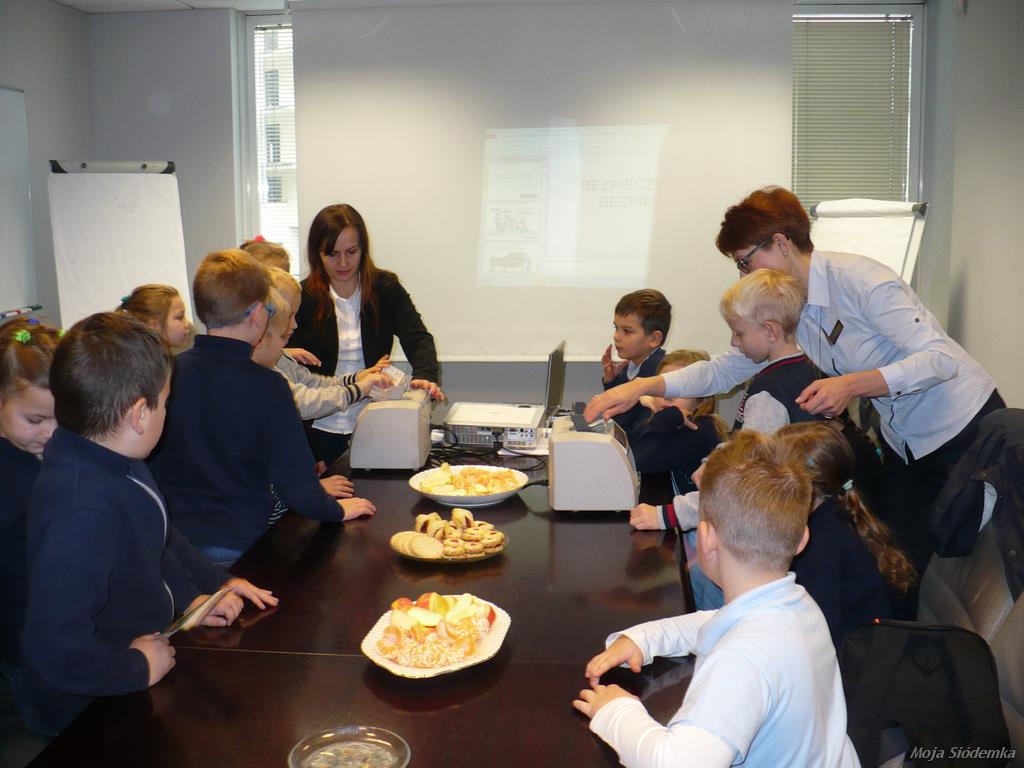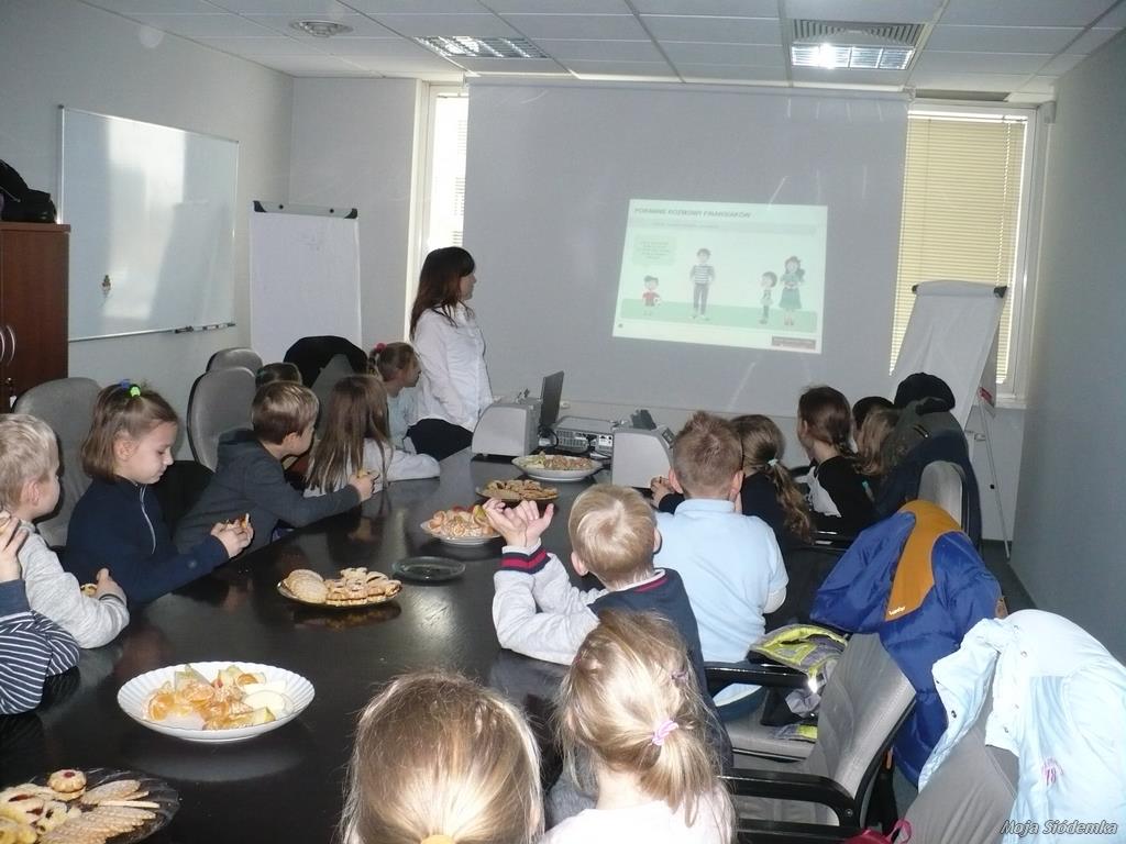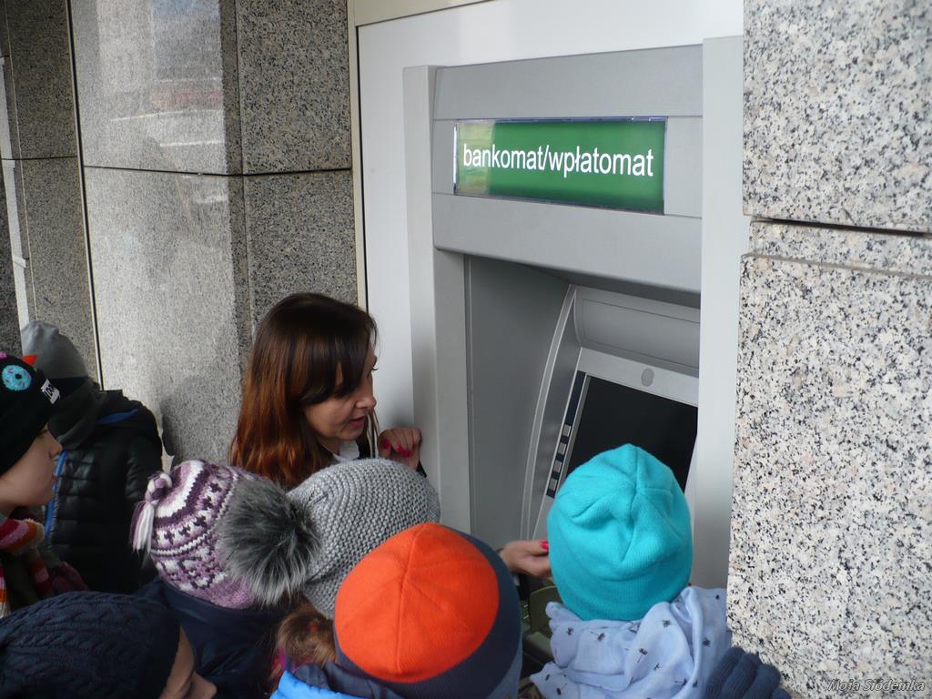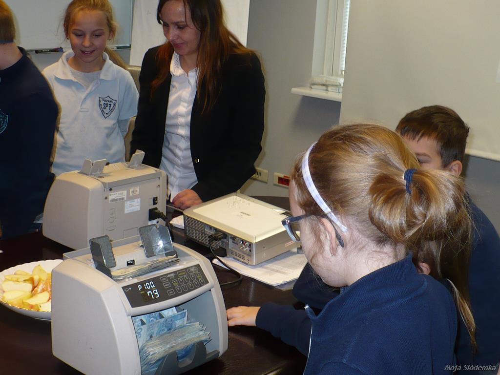 Najpierw zobaczyliśmy skarbiec, do którego prowadziło mnóstwo grubych drzwi. Obejrzeliśmy prezentację o rodzinie Finansiaków. Zostaliśmy poczęstowani owocami i ciastkami. Panie pokazywały nam maszyny, które liczą pieniądze. Poszliśmy do gabinetu dyrektora. Mogliśmy usiąść w fotelu i przybić pieczątkę. Dostaliśmy też długopisy. Na zakończenie każdy z nas wpłacał albo wypłacał pieniądze w bankomacie. Wycieczka bardzo mi się podobała.