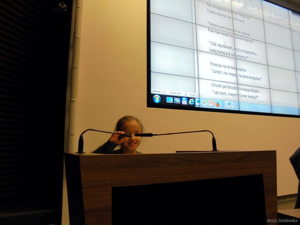 Tam zajęliśmy miejsca przeznaczone dla studentów i obejrzeliśmy na wielkim ekranie trzy filmiki. Obejrzane obrazy wywołały ciekawą dyskusję. Następnie mogliśmy podchodzić do centralnego miejsca na sali przeznaczonego dla wykładowcy i czytaliśmy przez mikrofony fragmenty wierszy Jana Brzechwy.