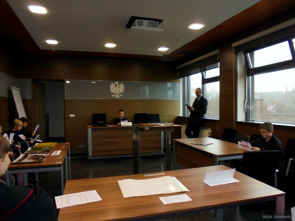 Później przeszliśmy do sali rozpraw. Przed wejściem na salę każdy dostał kartkę ze swoją rolą i zajął wyznaczone miejsce.