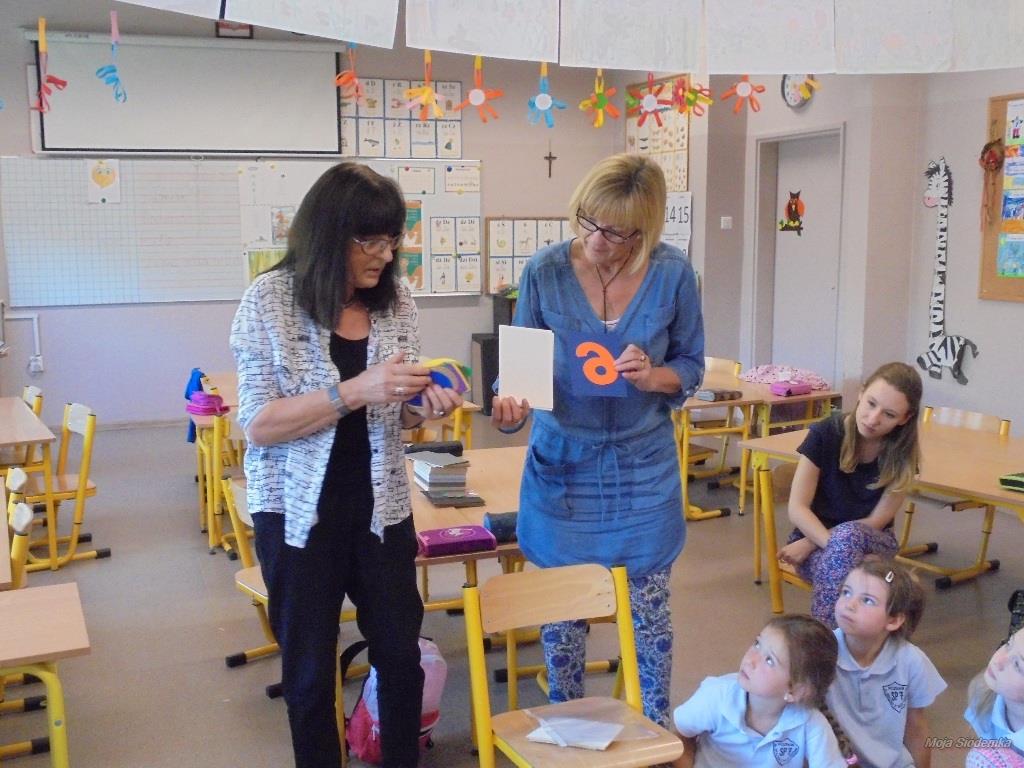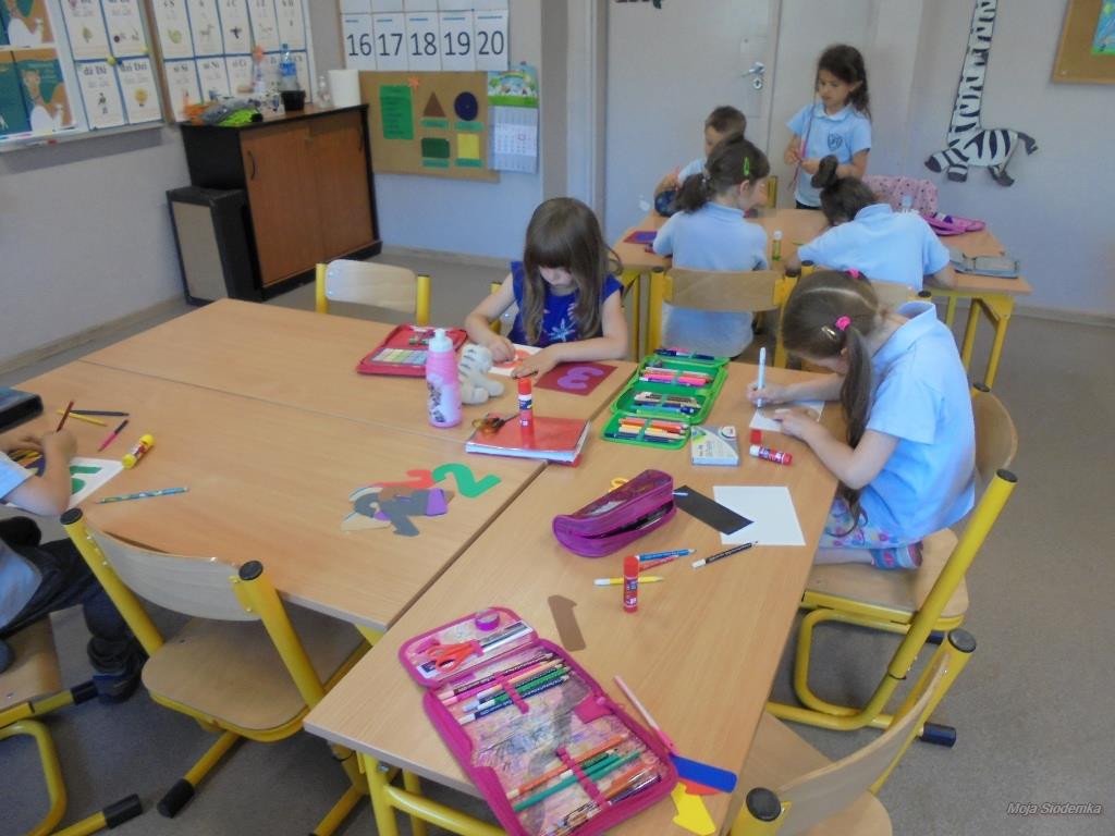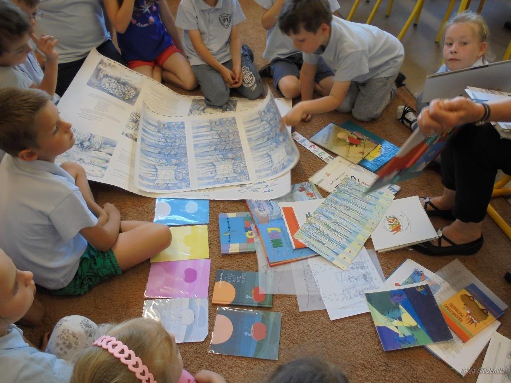 Pani Elżbieta przyniosła na spotkanie i warsztaty z dziećmi egzemplarze książek, które ilustrowała, między innymi Rozwesołki , Rozwesołki drugie oraz Imię to nie fraszka. Przyniosła również plakaty i karty z fragmentami ilustracji w jej wykonaniu pokazujące poszczególne etapy pracy nad tworzeniem ilustracji do książki. Dzieci z uwagą słuchały opowiadania pani Krygowskiej Butlewskiej o współpracy z pisarką książek dla dzieci panią Joanną Papuzińską. Zadawały też bardzo dużo pytań. Mogły z bliska, a nawet z bardzo bliska, bo z pomocą lupy zobaczyć, jak wyglądają poszczególne kreski stawiane na ilustracji. Dzieciom bardzo podobały się różne śmieszne ludziki i zwierzątka. Po wysłuchaniu wierszyków o miesiącach i obejrzeniu do nich ilustracji, jakie wykonała pani Elżbieta same mogły zilustrować cyfry, które tworzą ich datę urodzenia. To zajęcie dało dzieciom dużo radości i okazało się, że wyobraźnia dziecięca nie zna granic, a i konkurencja dla Pani Elżbiety już rośnie. Na koniec uczniowie rozwiązywali zadania matematyczne
