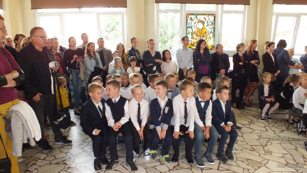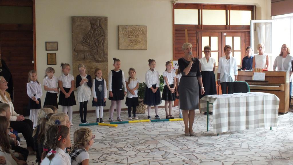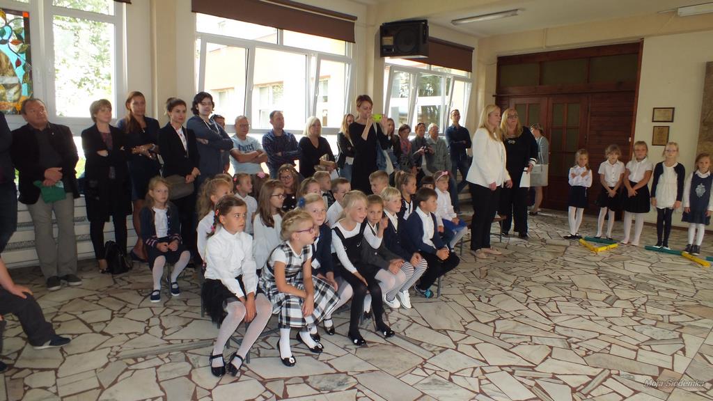 O godzinie 11:30 w holu naszej szkoły zgromadziło się sporo pięknie ubranych dzieci. To pierwszoklasiści najmłodsi uczniowie naszej szkoły, którzy 4 września rozpoczęli swoją przygodę z Siódemką. Uroczyście przywitała ich Pani Romualda Graffunder, która w tym roku będzie opiekować się klasą III. Następnie głos zabrała Pani Dyrektor Anetta Dropińska-Pawlicka, która w słowach skierowanych do pierwszaków mówiła o rozpoczynającej się nowej przygodzie, a rodziców zapewniała, że wybór Siódemki był najlepszym jaki mogli podjąć dla swoich dzieci.