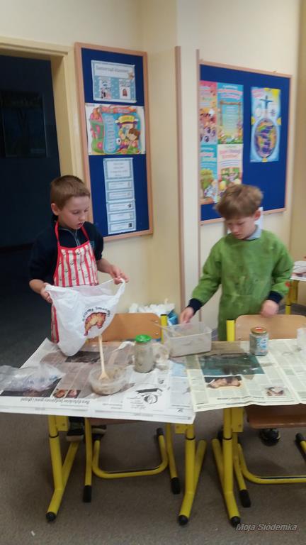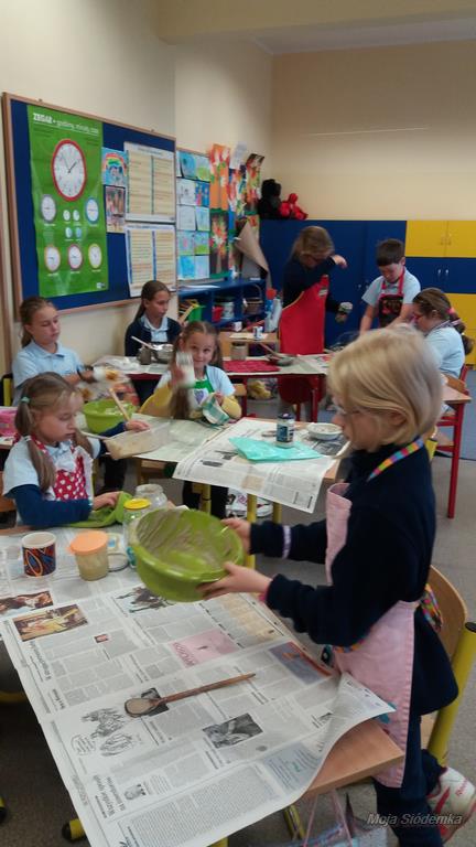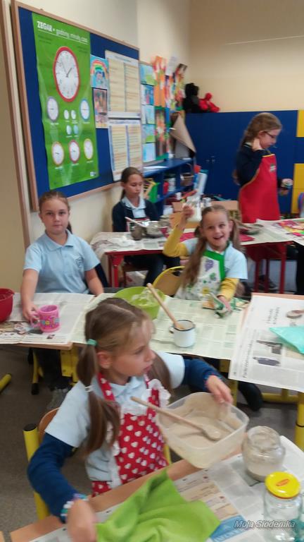 Wobec powyższego – chleb przyszedł do nas. W czwartek uczniowie poznali proces wypiekania chleba dawniej i dzisiaj. Obejrzeli pracę piekarzy. Zapoznali się z produkcją zakwasu. I nadszedł nareszcie najważniejszy moment dnia – przygotowanie własnego, samodzielnie wymieszanego zakwasu chlebowego. To zakwas z mąki żytniej, pełnoziarnistej. Dzieci dowiedziały się, że wyrażenie „pełnoziarnisty” oznacza, iż ziarno jest czyste, ale nienaruszone. I w tej postaci rozciera się je na mąkę.