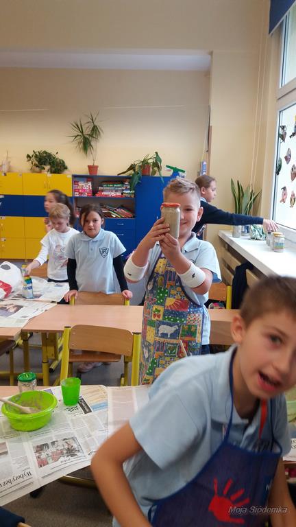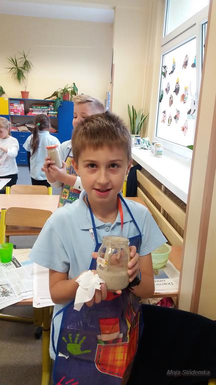 Ustaliliśmy proporcje wody i mąki, wymieszaliśmy składniki i tak przygotowany w miskach zakwas, przełożyliśmy do słoików, aby bezpiecznie przetransportować go do domu. Uczniowie wiedzą, że należy nakryć słoik przewiewną tkaniną, aby miał dostęp powietrza i „dokarmiać” przez 5-6 dni.