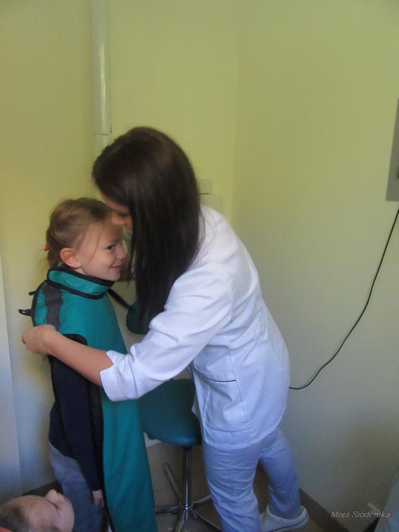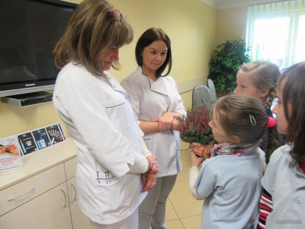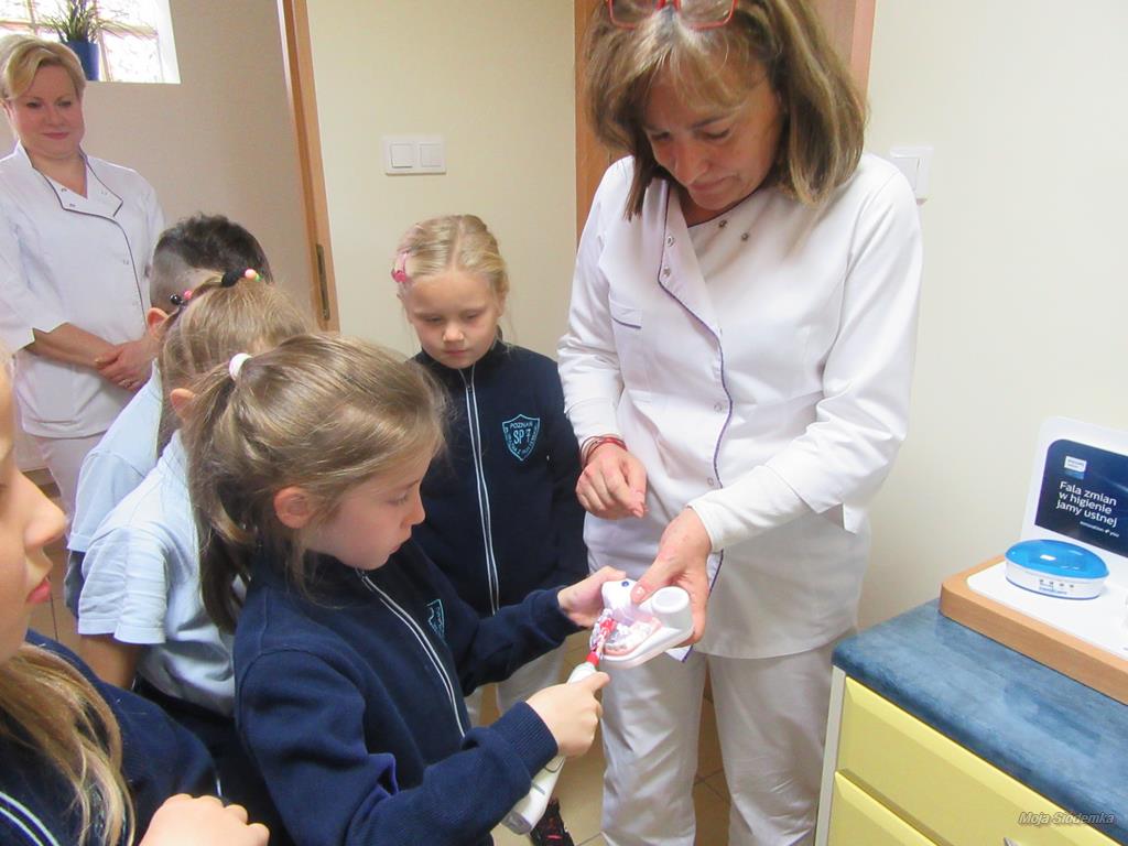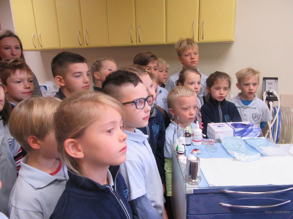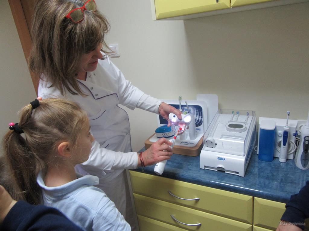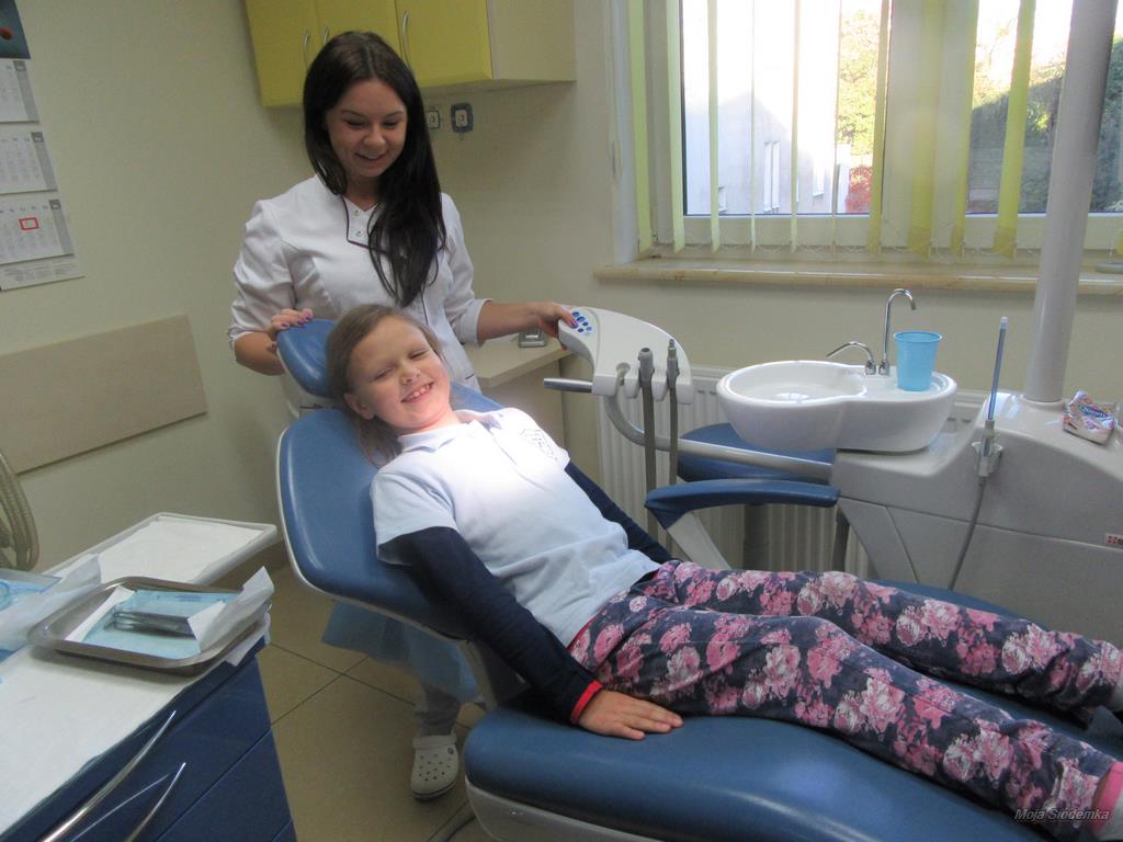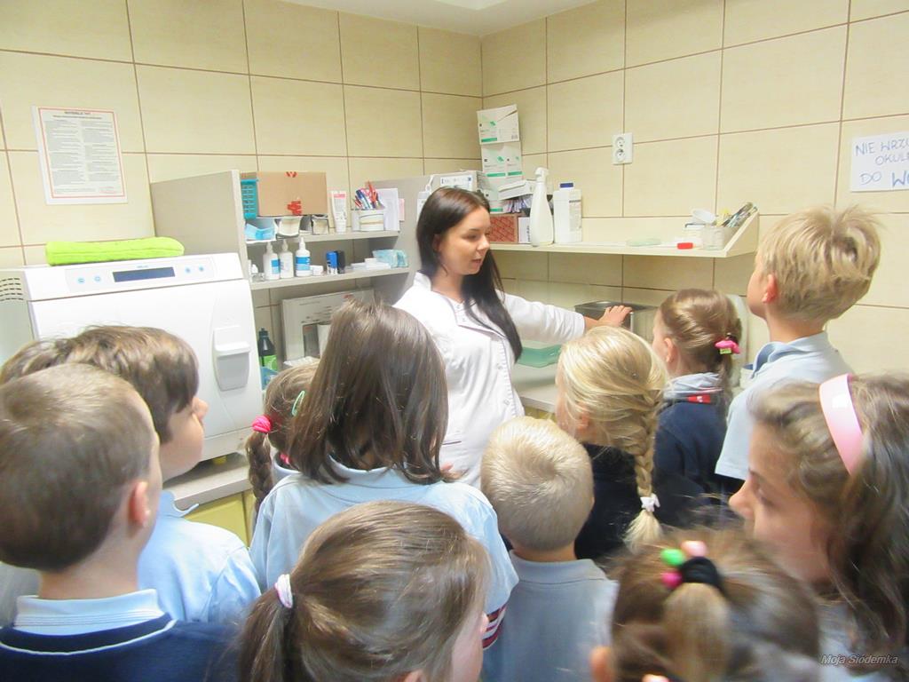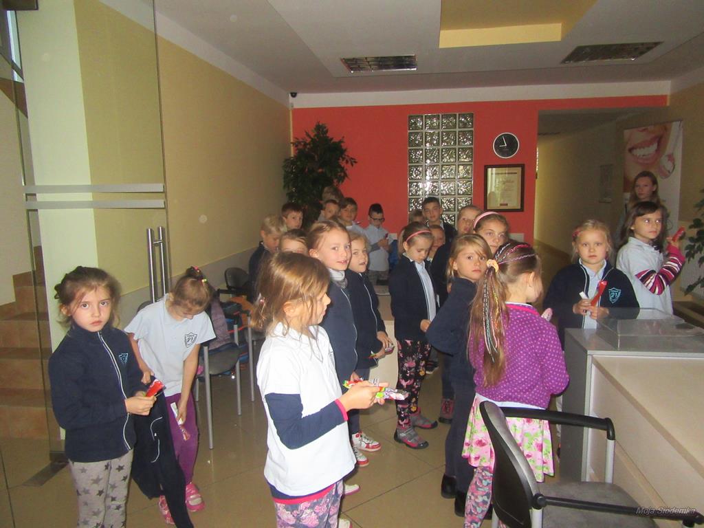 Aby sprawdzić w praktyce zdobyte dotychczas wiadomości, udaliśmy się do jednego z gabinetów stomatologicznych, znajdujących się  w  pobliżu naszej szkoły. Podczas wizyty w gabinecie dzieci mogły  zapoznać się szczegółowo z pracą dentysty. Nie straszny okazał się ani fotel dentystyczny, ani wiertła, o których pani doktor pieszczotliwie mówiła, iż, są to po prostu dentystyczne długopisy. Dzieci zapoznały się z takimi pojęciami jak sterylizacja, bakterie, próżnia, ciśnienie. a przymierzany fartuch do wykonywania zdjęć rentgenowskich, okazał się bardzo ciężki. Wszystkie panie pracujące w gabinecie były pod wrażeniem  dużej wiedzy dzieciaków na temat prawidłowego dbania o higienę jamy ustnej oraz prawidłowego odżywiania. Okazało się, że cała klasa  zasłużyła  na miano dzielnego pacjenta, dlatego na koniec wizyty wszyscy otrzymali podarunki w postaci szczoteczek do zębów oraz tubki pasty do zębów. Wycieczka okazała się na tyle atrakcyjna, iż padły  nawet deklaracje, co do wykonywania przyszłego zawodu stomatologa, przez niektóre z dzieci.