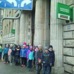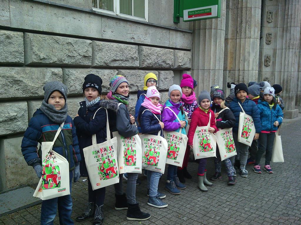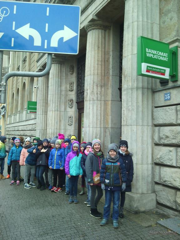 W jesienny piątkowy poranek 10 listopada udaliśmy się zgłębiać tajniki pracy w banku. Zostaliśmy zaproszeni na niezwykłą wyprawę do siedziby WBK przy pl. Wolności przez p. Anię mamę Mikołaja, która postanowiła podzielić się z nami kulisami swojego miejsca pracy. Przy drzwiach czekał na nas nasz przewodnik pan Marek.