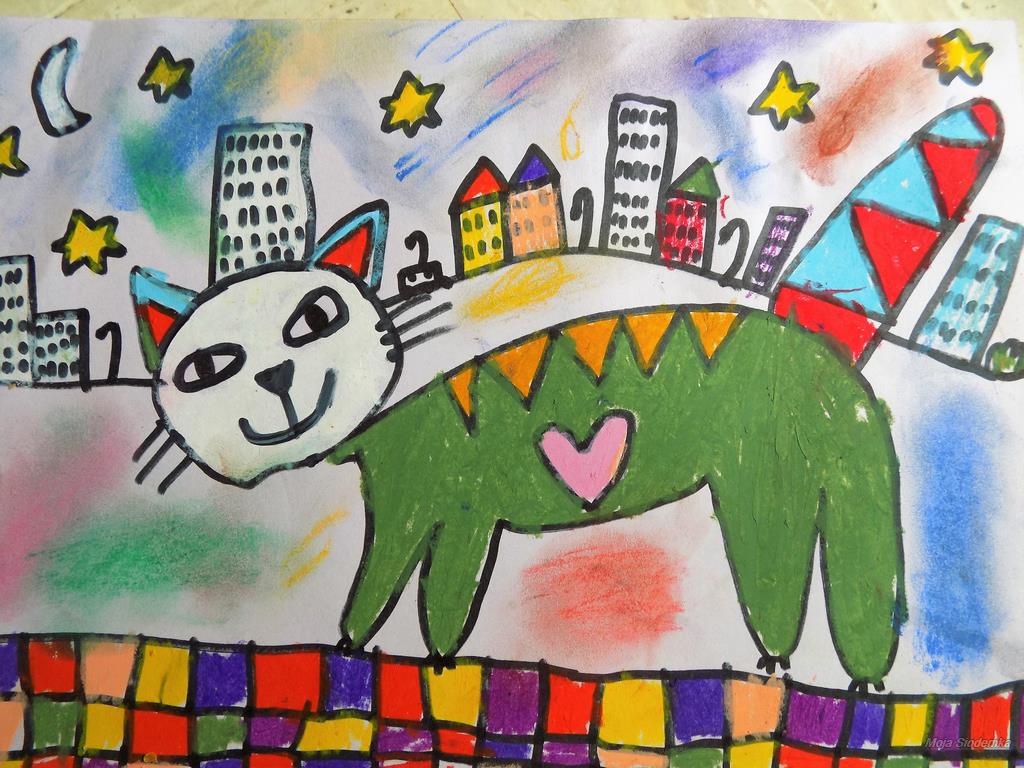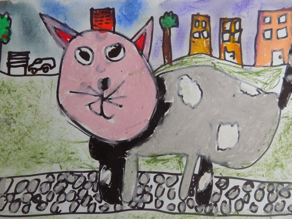 Hm, no cóż, my tak! I z tego naszego wspólnego rozważania powstały przecudne prace plastyczne, pokazujące nasze mruczki w ich miejskiej codzienności. Nie zawsze jest różowa i idealna. Nieraz muszą tułać się po ulicach w poszukiwaniu jedzenia, ze zdwojoną uwagą zważać na ruch miejski czy szukać schronienia w zimne, jesienno-zimowe dni. Niektóre koty mają szczęście i trafiają do pełnych ciepła i miłości domów, są zaopiekowanie i kochane.