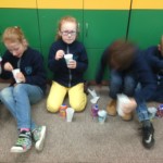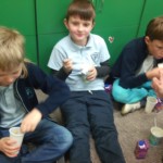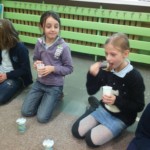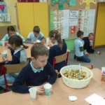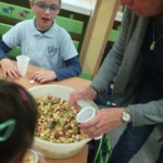 Po porcji teorii przyszła pora na najważniejsze – porcję zdrowego śniadania! I tak rozpoczęliśmy wspólne ucztowanie. Każdy z nas otrzymał jogurt naturalny bez cukru z płatkami kukurydzianymi, przepyszną bombę witaminową w postaci sałatki owocowej z jabłek, gruszek, bananów, kiwi i winogron oraz kartonik soku owocowego – a wszystko z możliwością dokładek 🙂