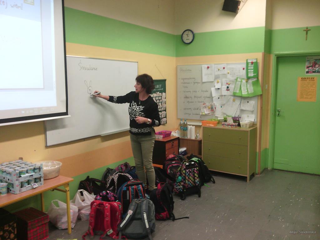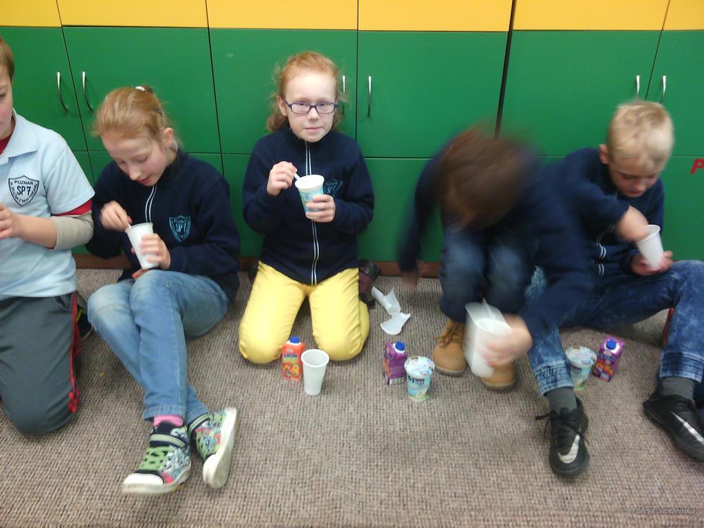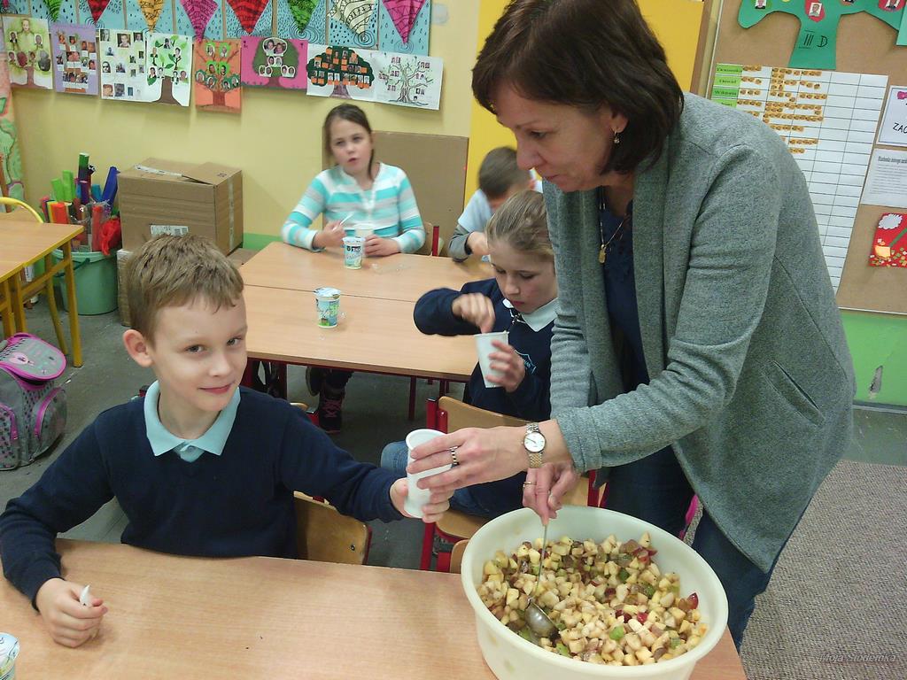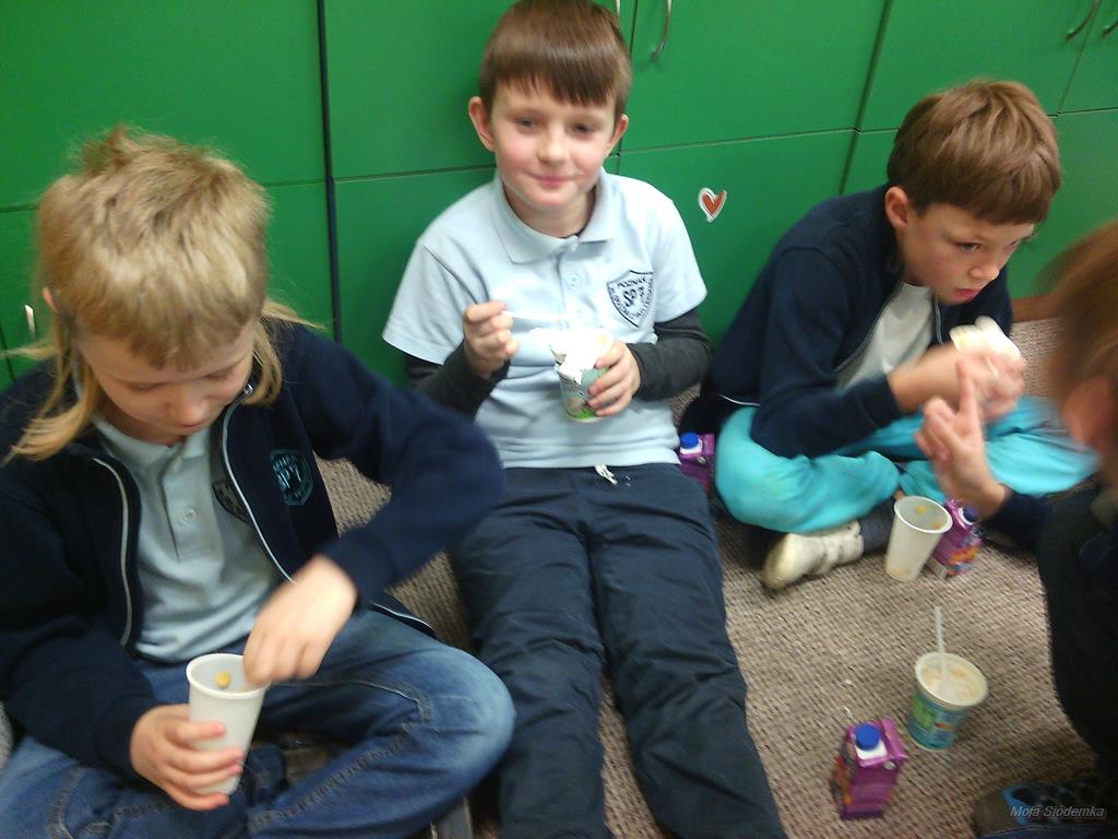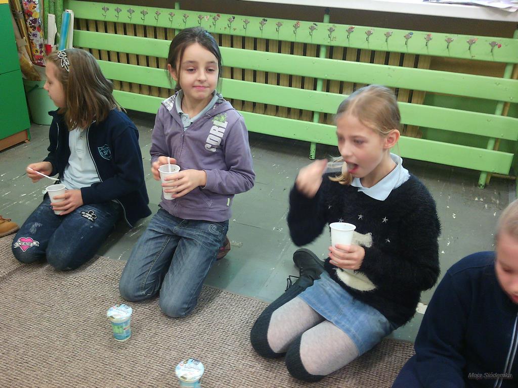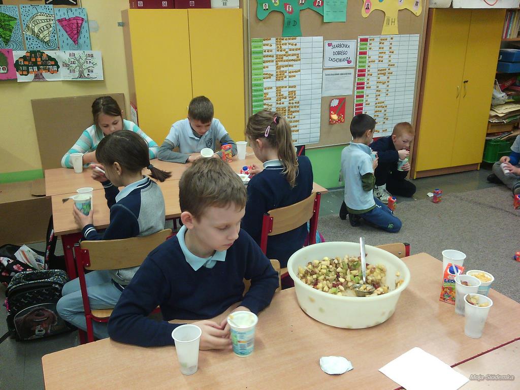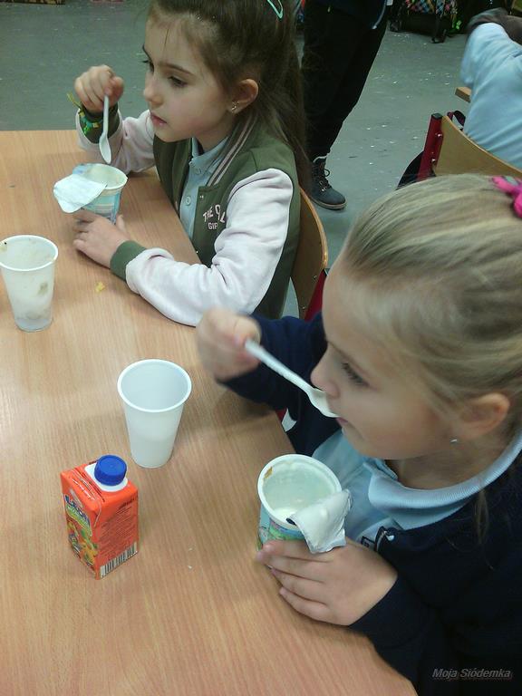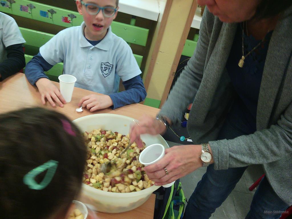 Po porcji teorii przyszła pora na najważniejsze – porcję zdrowego śniadania! I tak rozpoczęliśmy wspólne ucztowanie. Każdy z nas otrzymał jogurt naturalny bez cukru z płatkami kukurydzianymi, przepyszną bombę witaminową w postaci sałatki owocowej z jabłek, gruszek, bananów, kiwi i winogron oraz kartonik soku owocowego – a wszystko z możliwością dokładek 🙂