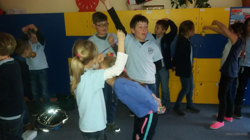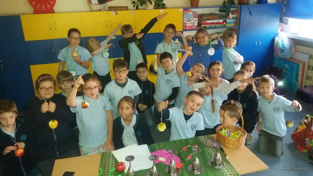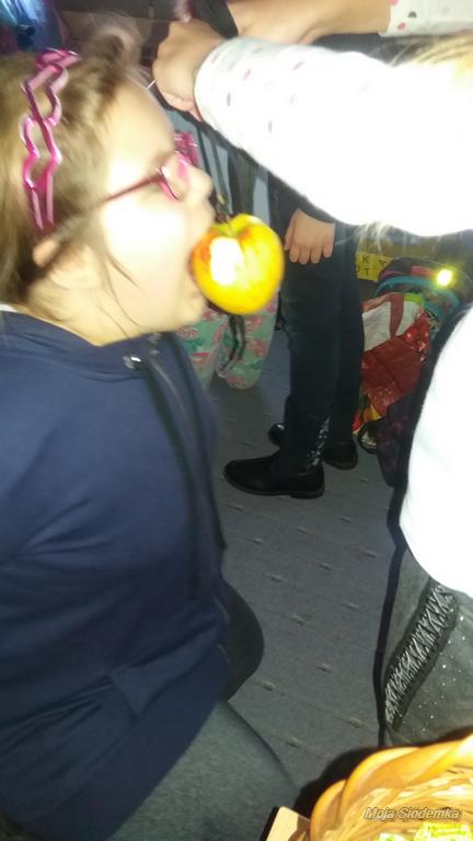 Najlepszą zabawą i wróżbą na wypełnienie się losu, było zajadanie zawieszonych na tasiemkach jabłek. Nie wolno nam było używać rąk, żadnych podpórek i innych ułatwień. Takie jabłko ciężko jest ugryźć! A co dopiero zjeść w wyznaczonym czasie! Ale niektórzy poradzili sobie zupełnie dobrze i jabłka były całkiem nieźle objedzone :).
