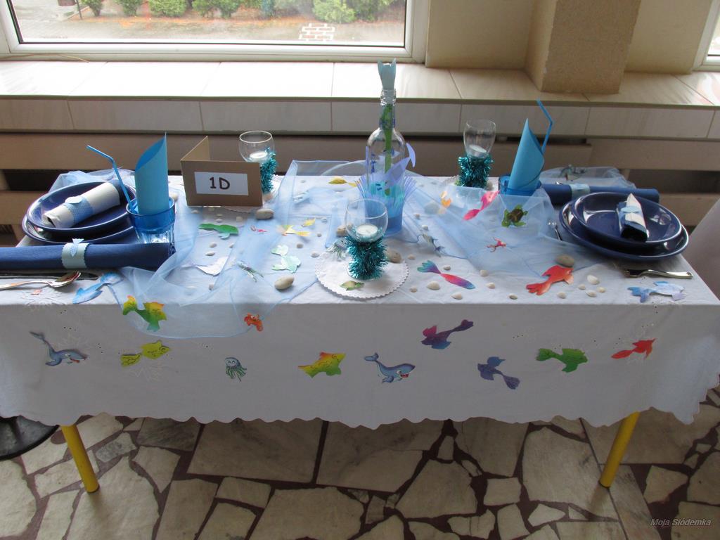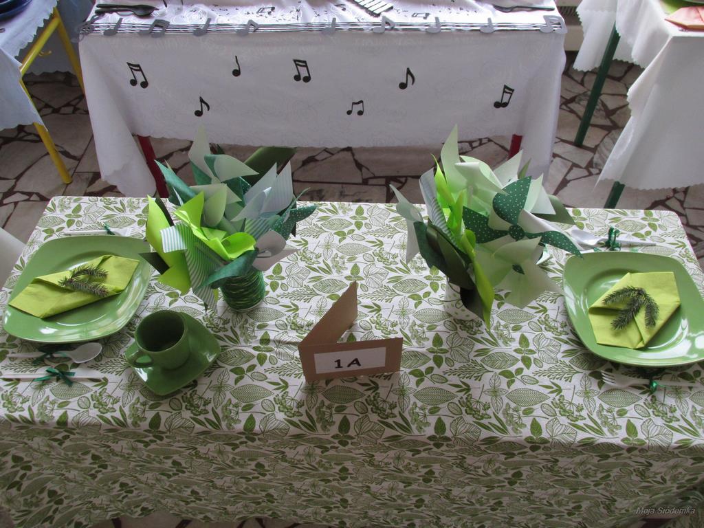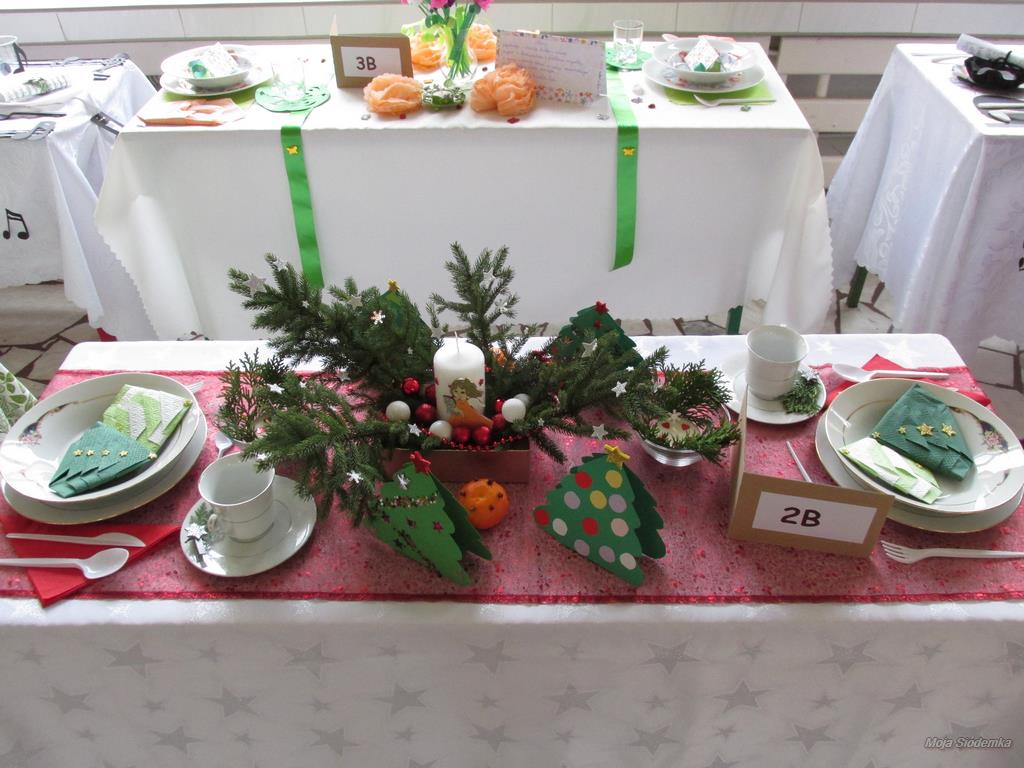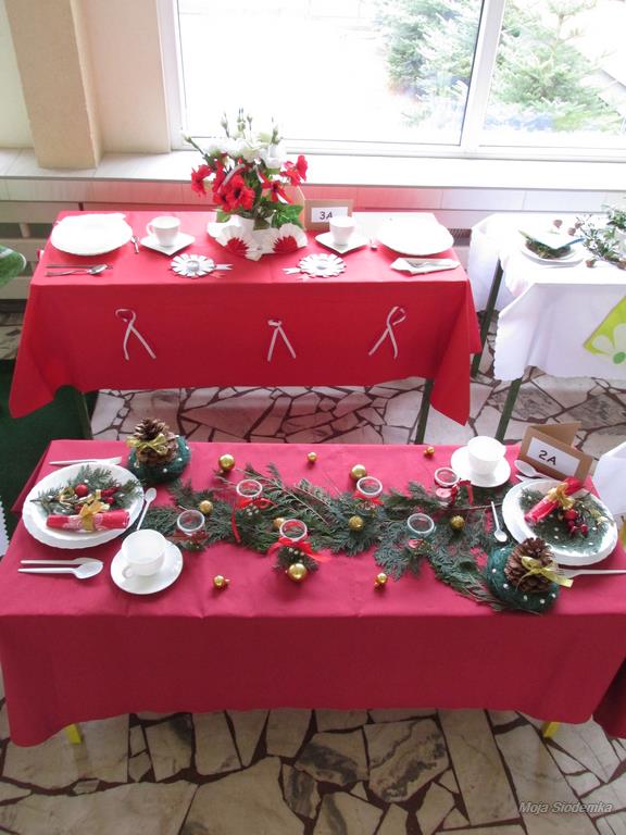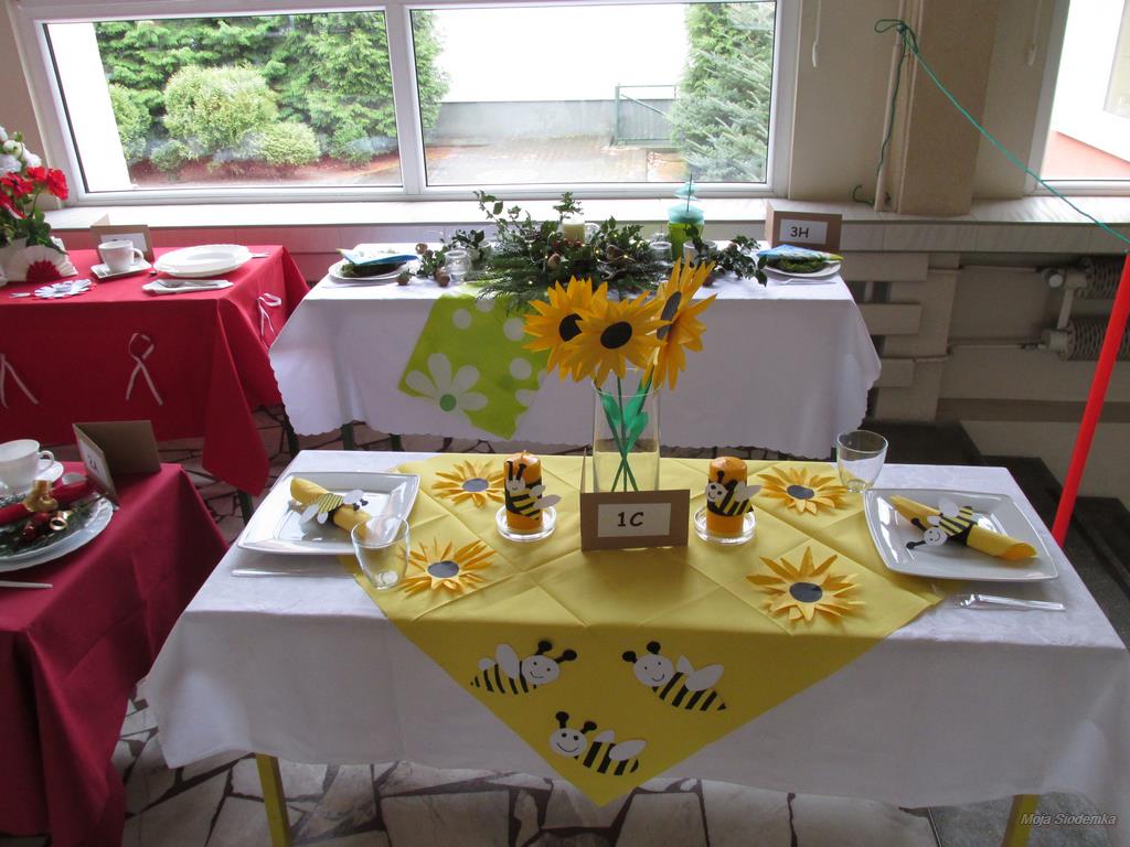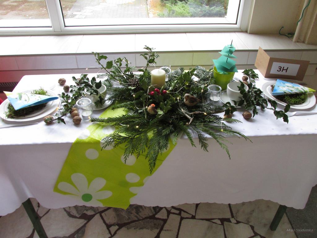 A na deser słów kilka o niezwykłych kompozycjach, które w drugim tygodniu grudnia pojawiły się w holu głównym. Tak , tak chodzi o wspaniale udekorowane stoły. Może kogoś z Was zdziwiły nuty lub piłki nożne, będące elementami składowymi wystroju Nie ma jednak podstaw do niepokoju! Taki był zamysł realizacji trzeciego zadania, w którym klasy losowo wybierały tematykę udekorowania stołu. Stąd na obrusach niecodzienne przedmioty, jak flagi, papierowe pszczoły, kwiaty, a nawet sztuczna trawa, czy rozsypane znaki muzyczne. Czy potraficie odgadnąć, jaki temat przewodził poszczególnym klasom Spróbujcie, a potem sprawdźcie odpowiedzi na zdjęciach.