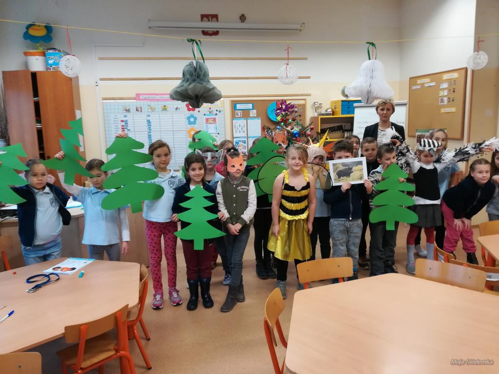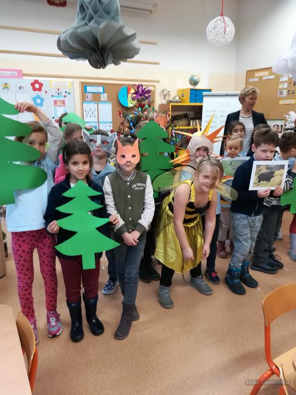 We wtorek, 5 grudnia dzieci z kółka recytatorskiego wraz z uczniami klasy 2b odwiedziły najmłodszych uczniów naszej szkoły, czyli dzieci z oddziału przedszkolnego. Przygotowały dla nich krótką inscenizację pt. Co słychać w jesiennym lesie. Inscenizację przygotowywały na zajęciach kółka recytatorskoliterackiego, a rekwizyty i kostiumy zostały wykonane z pomocą rodziców. Uczniowie bardzo przeżywali swój występ. Zależało im, aby wypaść jak najlepiej. Przez kilka tygodni ćwiczyły dykcję oraz właściwą interpretację tekstu, poszczególnych ról. Dużą uwagę przywiązywały do tego, aby gestem i zachowaniem pokazać, jakim są zwierzątkiem.