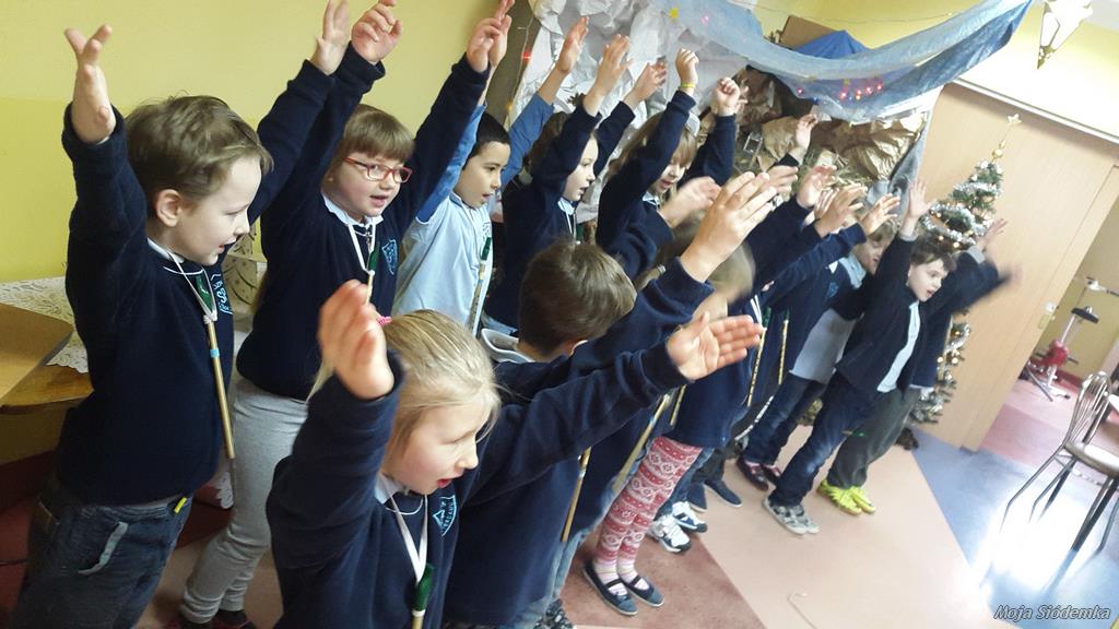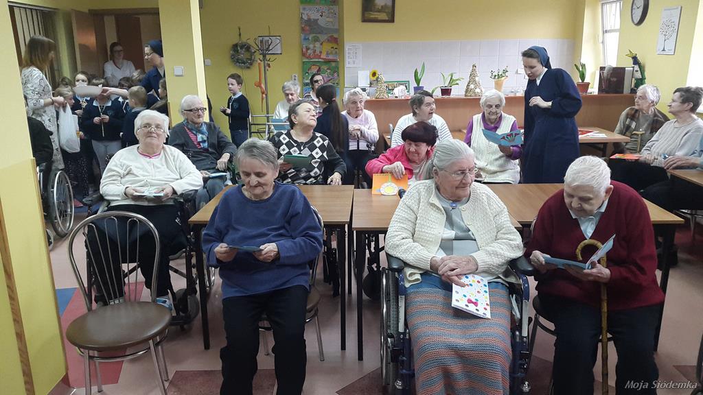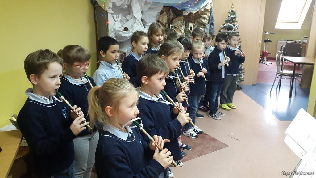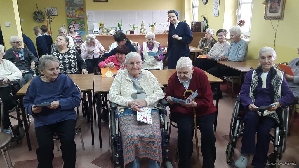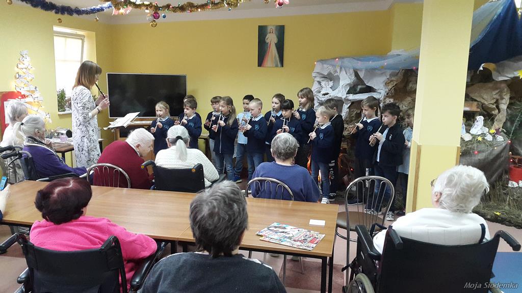 Klasa II b pojechała do Domu Pomocy Społecznej, aby ofiarować wszystkim Paniom : uśmiech, muzykę i laurki wykonane przez uczniów klas IIII. Dzieci pięknie zagrały koncert kolęd na flażoletach oraz zatańczyły dwa tańce ludowe do melodii kolęd. Na koniec z najlepszymi życzeniami zadedykowały piosenkę Uroki zimy. Wszystkie Panie z radością śpiewały kiedy dzieci grały.