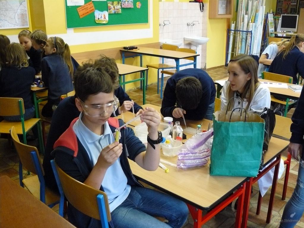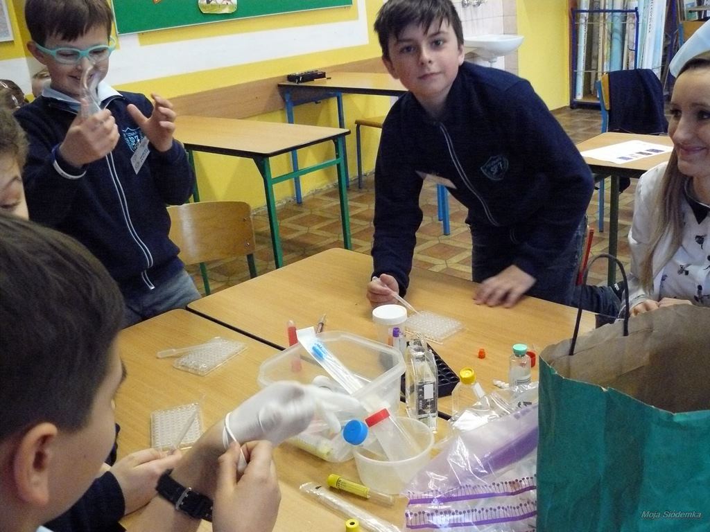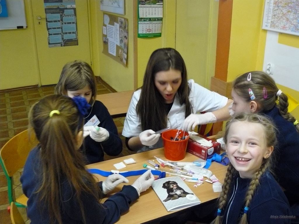 Nasi studenci z klas IV, tym razem uczestniczyli w zajęciach na terenie szkoły. Absolwentki Wydziału Analityki Uniwersytetu Medycznego przygotowały dla nich niezwykle atrakcyjne warsztaty: dzieci obserwowały bakterie, uczyły się posługiwać sprzętem laboratoryjnym, rozpoznawały składniki krwi. Najwięcej atrakcji wzbudziły ćwiczenia (oczywiście teoretyczne!) w pobieraniu krwi do badań laboratoryjnych.