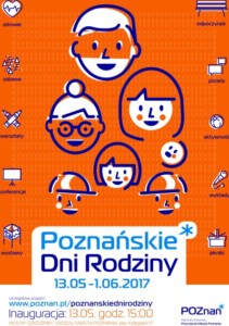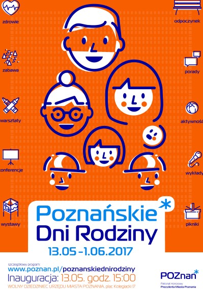 W dniach od 13 maja do 1 czerwca 2017r. w zakresie oferty instytucji miejskich oraz współpracy z podmiotami działającymi komercyjnie, Miasto Poznań organizuje V Poznańskie Dni Rodziny. W ramach planowanych wydarzeń zachęcamy mieszkańców Miasta Poznania do uczestnictwa w festynach, warsztatach, spektaklach, konferencjach i wielu innych atrakcjach, które pozwolą odkryć rodzinne oblicze Poznania. Dnia 13 maja 2017 r. w godzinach 15:00 18:00 na dziedzińcu Urzędu Miasta Poznania odbędzie się Inauguracja Poznańskich Dni Rodziny.