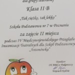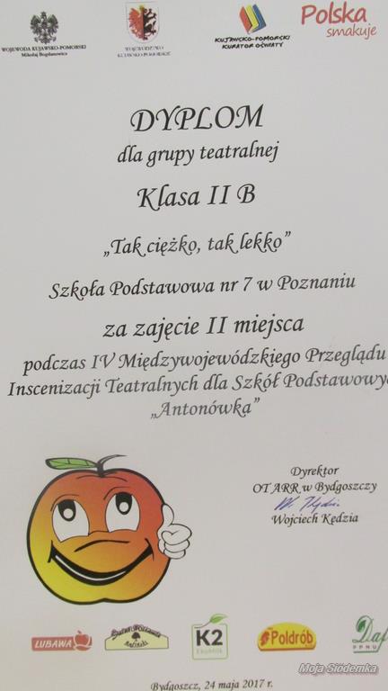 24 maja 2017 klasa II B brała udział w finale IV Międzywojewódzkiego Przeglądu Inscenizacji Teatralnych dla Szkół Podstawowych „Antonówka” w Bydgoszczy. Na scenie kinoteatru „Adria” zaprezentowało się 11 zespołów teatralnych.