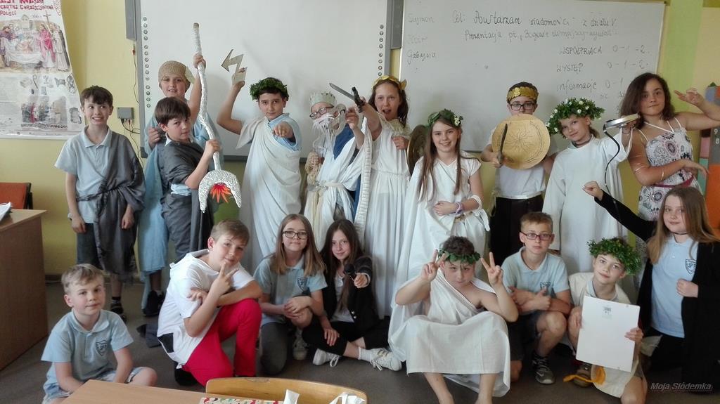 Niecodzienne lekcje historii miały miejsce w naszej szkole. Do krainy mitów przenieśli nas uczniowie klas czwartych, którzy w ramach lekcji powtórzeniowej przygotowali prezentację wybranego boga z mitologii greckiej. Czwartoklasiści pięknie przebrani za bogów i boginie, z atrybutami w dłoni, w ciekawy sposób opowiadali o sobie.