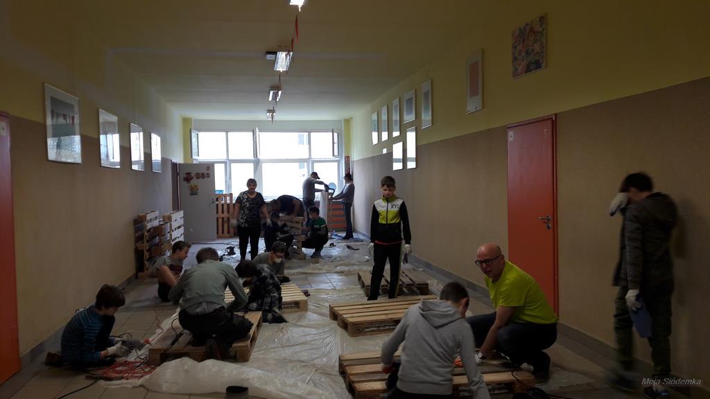 14 kwietnia, w sobotę z samego rana, 16 wolontariuszy z Siódemki, przy wsparciu rodziców z klas 5a i 6a oraz Rady Rodziców, rozpoczęło akcję tworzenia mebli do kolejnych Stref relaksu.