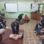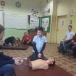 Po części teoretycznej przyszedł czas na praktykę. Wszystkie klasy siódme przez dwie godziny mogły przećwiczyć pod okiem wykwalifikowanych instruktorów zdobytą wiedzę. Każdy uczeń wykonywał resuscytację krążeniowo-oddechową na fantomie, ucząc się, jak przywrócić u poszkodowanego akcję serca. Ponadto wszyscy bandażowali głowę, usztywniali złamaną rękę za pomocą chusty, a złamaną nogę przy pomocy bandaża i drugiej, zdrowej nogi.