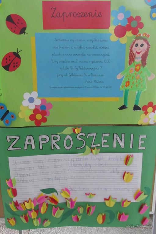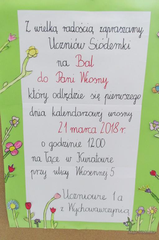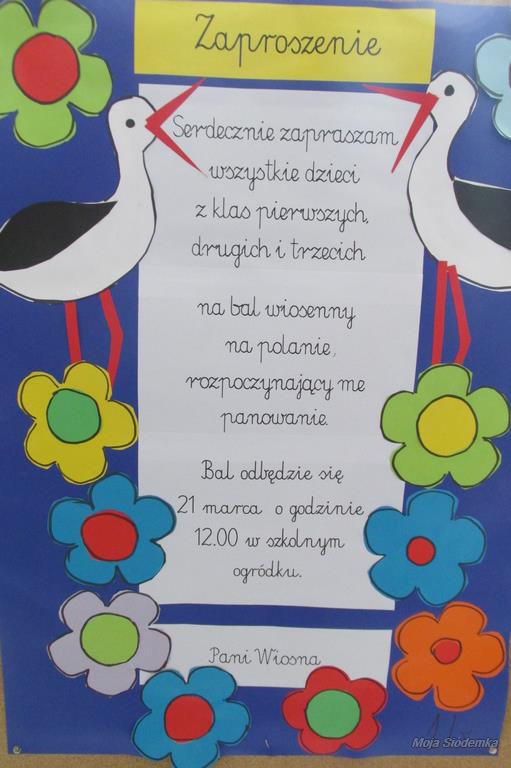 Drugoklasiści potwierdzili, że kolorowe, przewiewne stroje przydadzą się na pewno i rozwiesili zaproszenia na Wiosenny Bal. Gdzie Na leśnej polanie wśród kwiatów, przy wtórze brzęczenia owadów, rozświetlonej promieniami słońca. Obiecali, że do tańca zagra ptasia orkiestra.