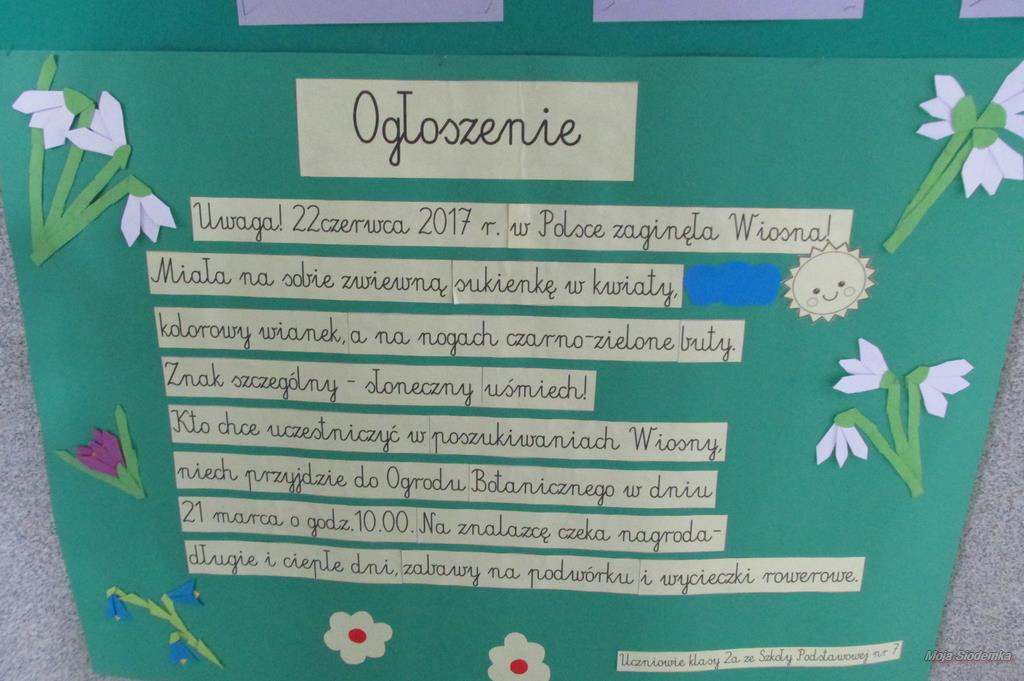 Drugoklasiści z niepokojem porozwieszali ogłoszenia z dokładnym opisem poszukiwanej pory roku. Czyżby bali się, że zapomni o nas Wskazówką dla poszukiwaczy wiosny były charakterystyczne elementy jej stroju – zieleń, kwiaty oraz zapach rozgrzanej słońcem ziemi. Jak na ogłoszenie przystało, wszystkim znalazcom została obiecana nagroda w postaci długich, ciepłych dni i śpiewu ptaków.