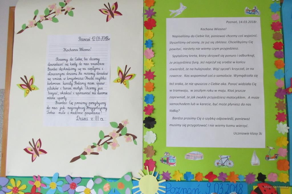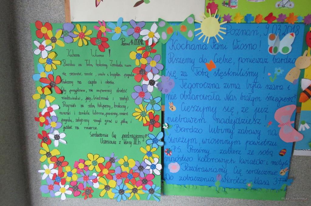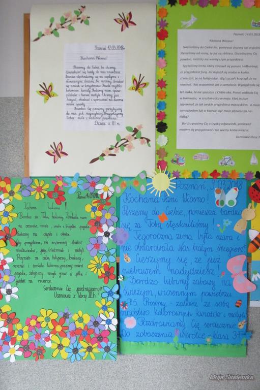 Uczniowie z klas trzecich napisali długie, wytęsknione listy, które dodatkowo pięknie ozdobili wiosennymi kwiatami, biedronkami i motylami. Narzekali na zbyt długą zimową szarość, mróz i krótkie dni, oczekując od wiosny szybkiej zmiany w otoczeniu. Każdy trzecioklasista marzył o słońcu, kolorowych łąkach, ożywionych jasną zielenią drzewach i długich dniach.