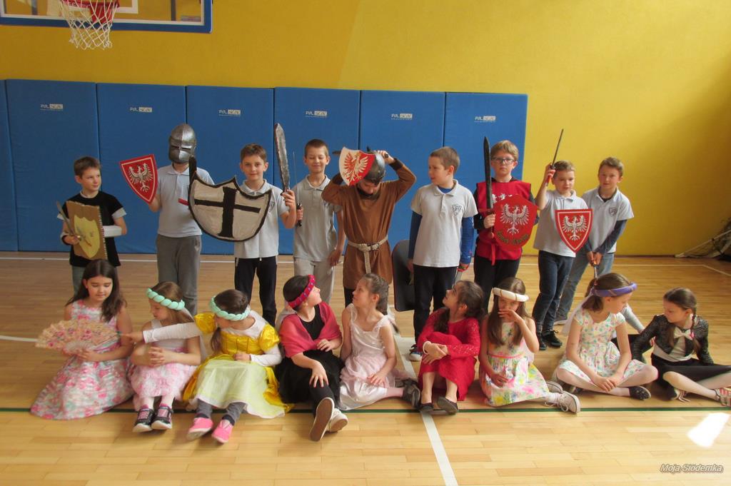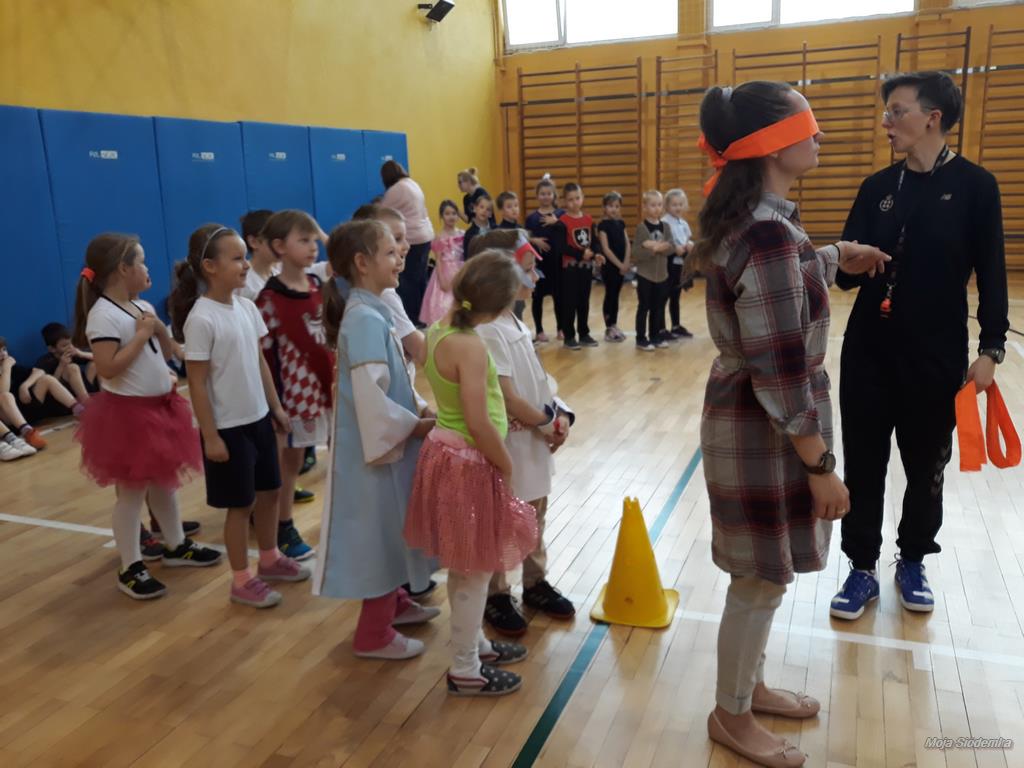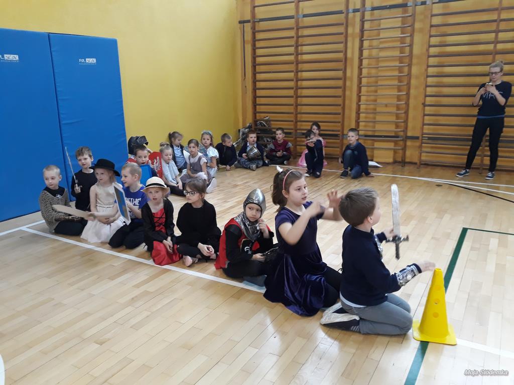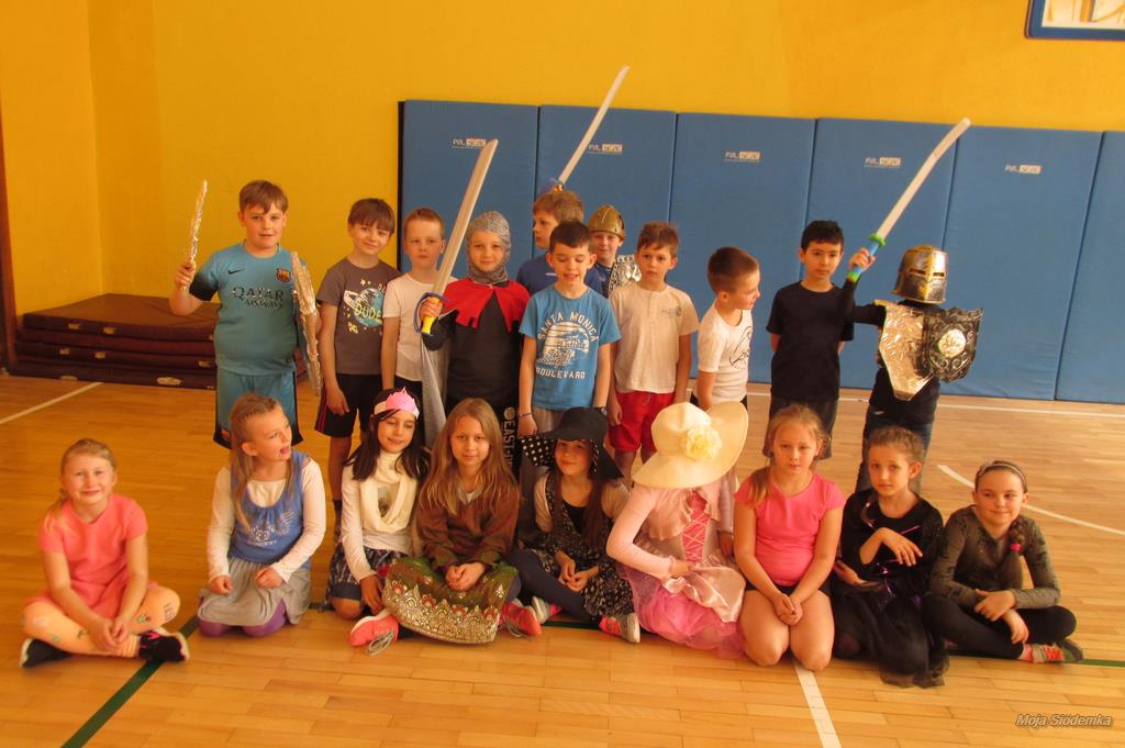 Rywalizacja rozpoczęła się trudnym zadaniem, w którym młode damy musiały z gracją pokonać odcinek drogi , nie pozwalając spaść umieszczonej na głowie książce, a dzielni rycerze asekurowali je i służyli pomocą. Dużo śmiechu i radości wywołał konkurs przewożenia dam w karecie. W jej rolę wcielił się materac, na którym młode dziewczyny zostały niesione przez czterech śmiałków. Rycerze musieli wykazać się doskonałą koordynacją wzrokowo-ruchową i celnie trafić do piramidek z puszek. Zaufanie to podstawa każdej relacji, więc nasze damy dworu pozwoliły bez obaw poprowadzić się z zasłoniętymi oczami torem pełnym przeszkód i niespodzianek, a młodzieńcy dbali o ich pełne bezpieczeństwo. Wszyscy doskonale wywiązali się ze swoich zadań, a przy tym wspaniale bawili.