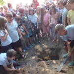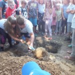 Po zweryfikowaniu wszystkich pomysłów zdecydowaliśmy, że w kapsule zamkniemy, między innymi numer Głosu Wielkopolskiego z datą 14 czerwca, monety, przybory do pisania ( długopisy, ołówki, kredki), zdjęcia oraz list od uczniów, w którym w kilku zdaniach napisaliśmy o tym, co jest dla nas ważne, co jest znakiem naszych czasów. Szczelnie zamkniętą kapsułę umieściliśmy w przygotowanym wcześniej miejscu na terenie boiska naszej szkoły, po czym została zasypana i oznaczona tablicą. Jaką frajdę sprawiło uczniom zakopanie kapsuły widać na zdjęciach.