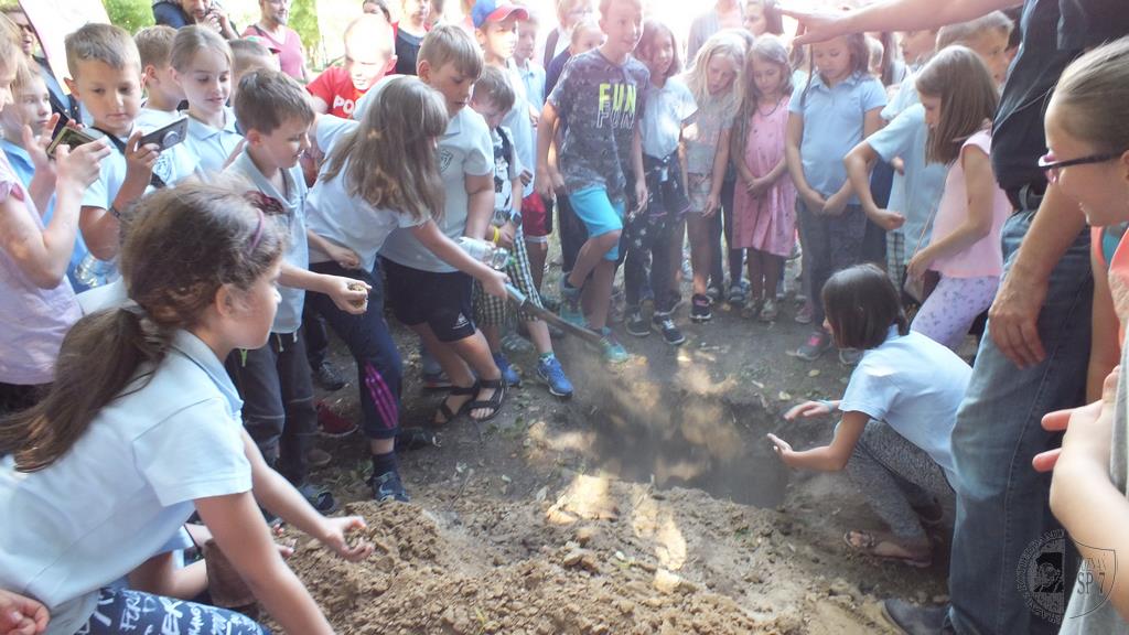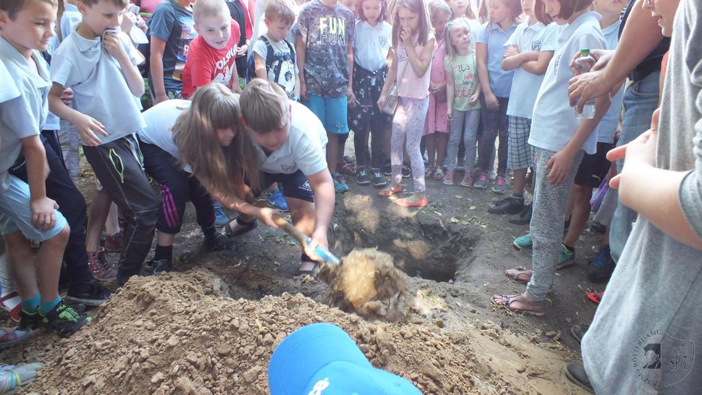 Po zweryfikowaniu wszystkich pomysłów zdecydowaliśmy, że w kapsule zamkniemy, między innymi numer Głosu Wielkopolskiego z datą 14 czerwca, monety, przybory do pisania ( długopisy, ołówki, kredki), zdjęcia oraz list od uczniów, w którym w kilku zdaniach napisaliśmy o tym, co jest dla nas ważne, co jest znakiem naszych czasów. Szczelnie zamkniętą kapsułę umieściliśmy w przygotowanym wcześniej miejscu na terenie boiska naszej szkoły, po czym została zasypana i oznaczona tablicą. Jaką frajdę sprawiło uczniom zakopanie kapsuły widać na zdjęciach.