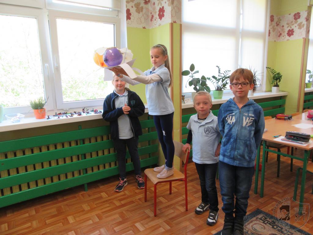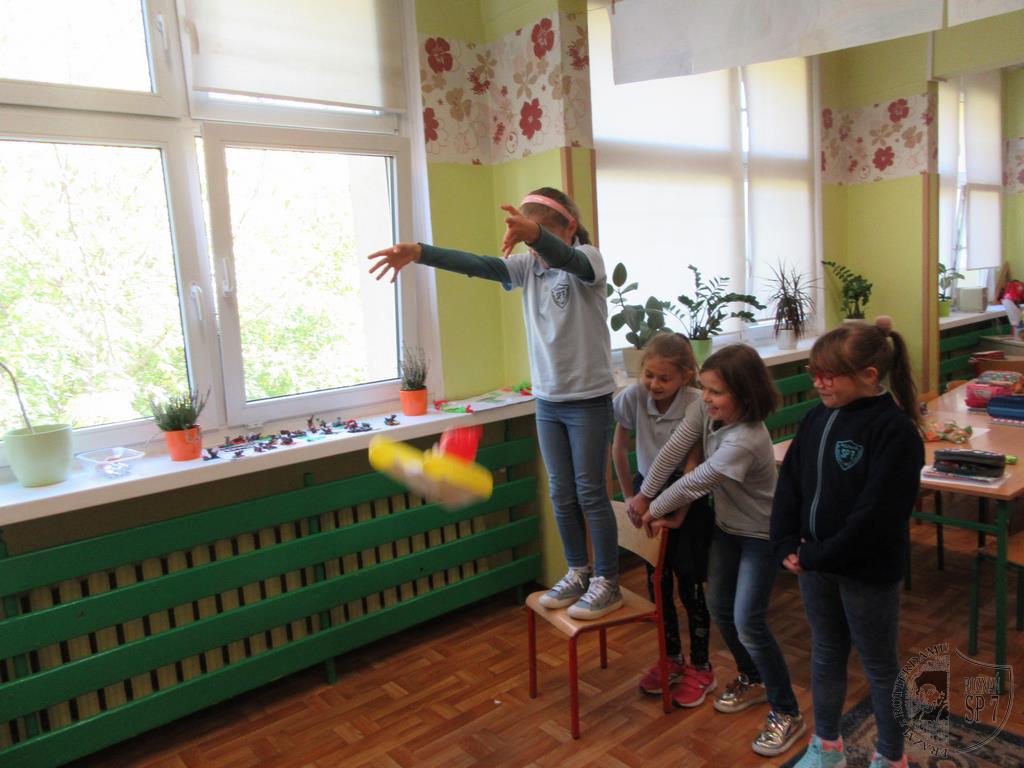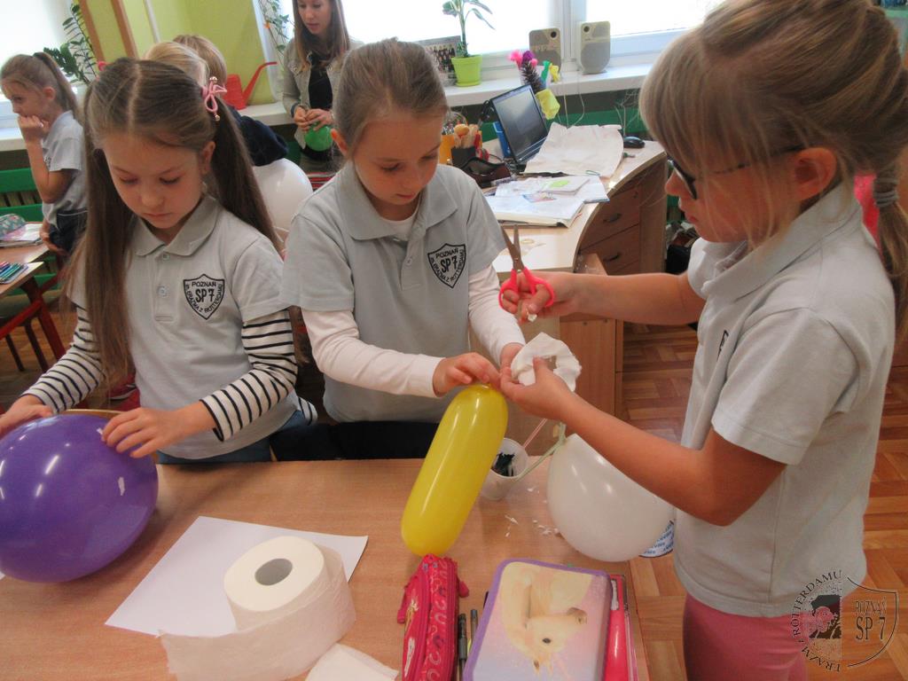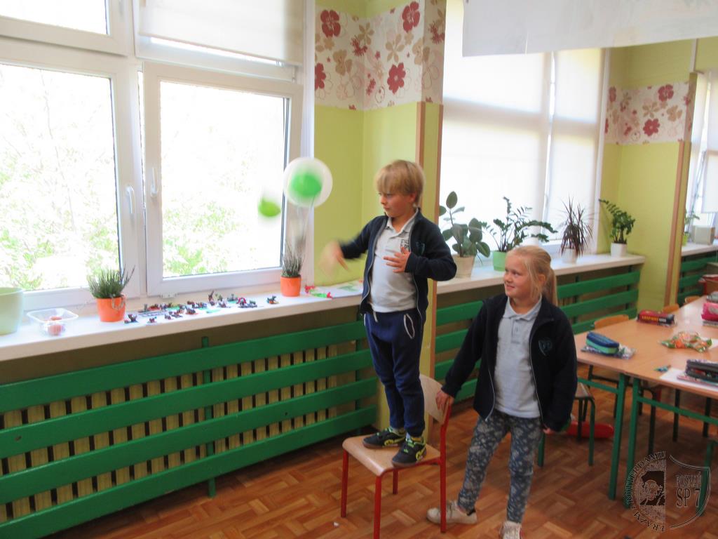 Każda grupa miała za zadanie zbudować konstrukcję jajkodromu, która umożliwi jajku bezpieczne lądowanie z wysokości około 2 metrów. Do dyspozycji grupy miały: plastikowy kubeczek, trzy słomki, trzy balony, ręcznik papierowy, piórka, trzy kartki papieru i taśmę klejącą. Ustaliliśmy, iż zadanie zostanie zaliczone, jeżeli jajko umieszczone w konstrukcji, po zderzeniu z ziemią nie stłucze się.