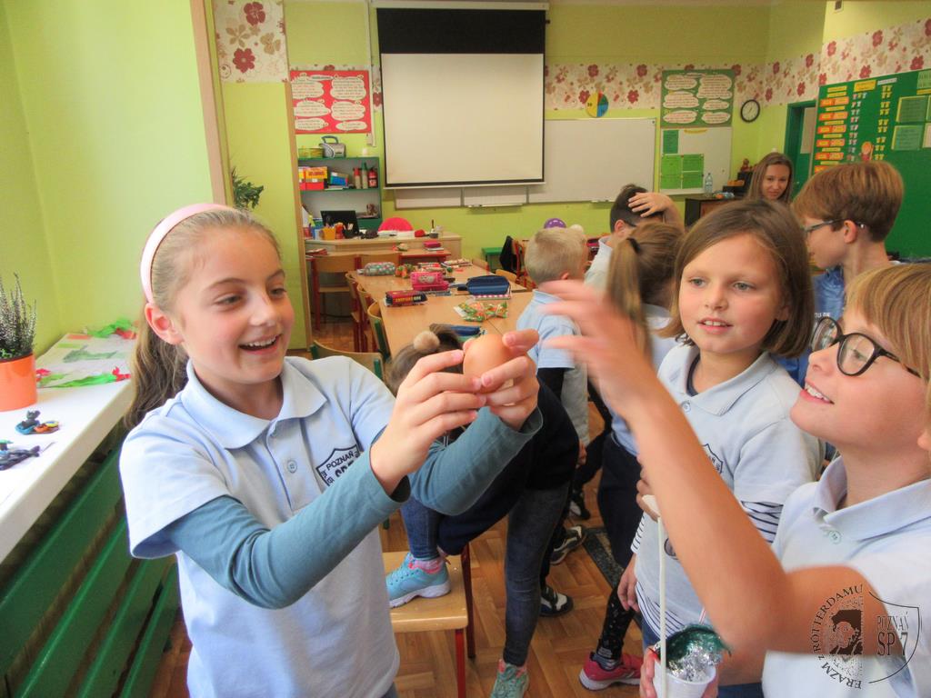 Zadanie sprawiło uczniom wiele radości, a na wynik eksperymentu każda grupa czekała w napięciu. Zadanie okazało się dość trudne do wykonania, bo tylko jednej grupie udało się nie zbić jajka.