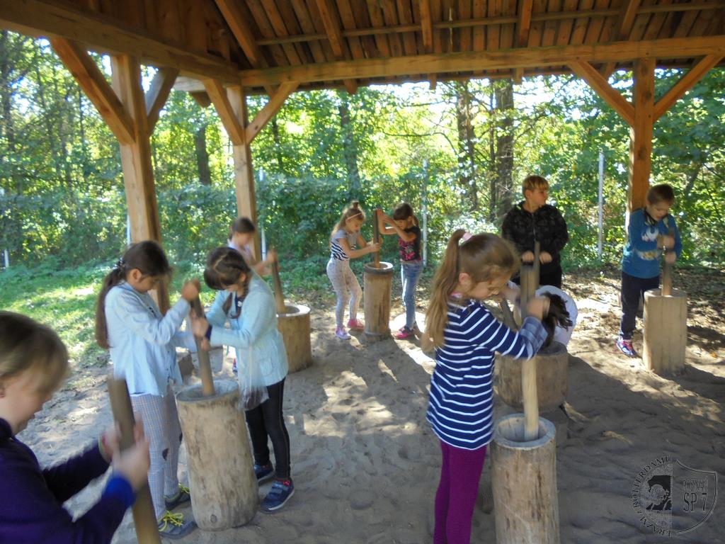 Dużą radość sprawiło dzieciom mielenie zboża w żarnach i stępach. Uczniowie przesiewali samodzielnie zmieloną mąkę przez specjalne sita i zabrali woreczki z mąką i kaszą do domu.