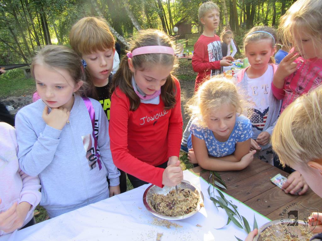 Niesamowitą frajdę sprawiło dzieciom własnoręczne przygotowywanie musli z płatków owsianych, miodu, rodzynek, żurawiny i orzechów. Wszyscy z apetytem zajadali się też kiełbaskami z ogniska, pieczonymi ziemniakami i różnymi gatunkami pieczywa. Wycieczka pozwoliła w dużym stopniu przyswoić uczniom wiedzę o rodzajach zbóż uprawianych w Polsce, a także o produktach, jakie z nich otrzymujemy.