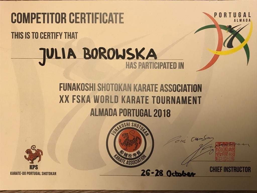 W dniach 26-28 października 2018 roku, Julia Borowska z klasy 7A brała udział w zawodach XX FSKA World Karate Tournament, odbywających się w miejscowości Almada w Portugalii. Łącznie brało w nich udział tysiąc zawodników z całego świata, którzy zmagali się w czterech konkurencjach.
