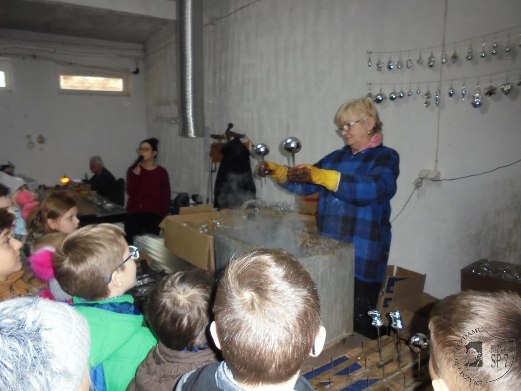 Najpierw wszyscy zobaczyliśmy jak w dmuchalni z wąskiej szklanej rurki pod wpływem ciepła i wdmuchiwanego powietrza powstają szklane bańki różnej wielkości. Bombki mogą mieć różne inne kształty, np. dzwoneczków czy gwiazdorków. Potem bańki te są wypełniane substancją chemiczną, która pod wpływem wysokiej temperatury substancja przyjmuje srebrny kolor. Dowiedzieliśmy się, że jeśli dodany zostanie inny barwnik, to bombki mają kolor czerwony, złoty, niebieski. Kiedy już bombka ma odpowiednią barwę trafia do rąk pań, które pracują w dziale zwanym dekoratornią. Tu błyszczące lub matowe kule zamieniają się w prawdziwe dzieła sztuki. Na bombkach pojawiają się choinki, gwiazdki, śnieg, a także przepiękne koronki namalowane farbą i brokatem.