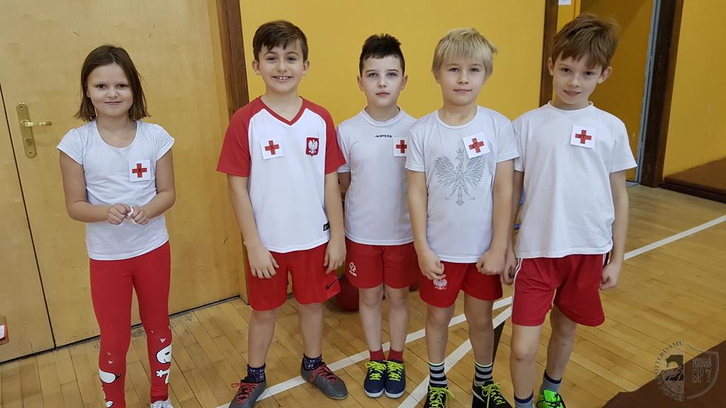 Ubrani w barwach narodowych spotkaliśmy się na sali gimnastycznej, by kolejny raz pochylić się nad kartami naszej historii. Pani Kasia przypomniała, jak trudną drogę musiała przejść nasza Ojczyzna, by w końcu cieszyć się wolnością.