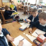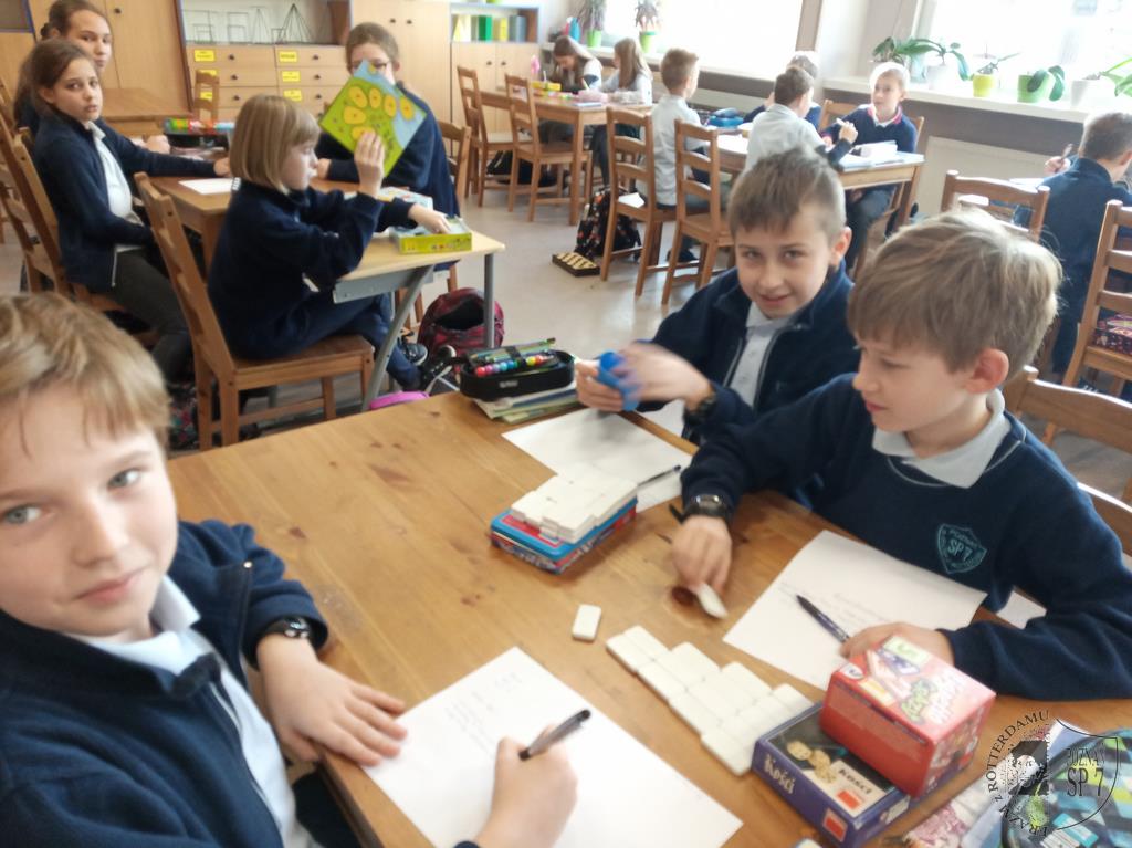 Uczniowie przybyli na lekcje z grami: Kości, Domino, Grzybobranie, Warcaby, Szachy, Chińczyk, Wyścig matematyczny, Dinoprzygoda, Pole rozrywek itp. Wspólnie odkrywaliśmy reguły matematyczne obowiązujące w grach, zasady gier oraz zastanawialiśmy się nad celem ustalonych reguł.