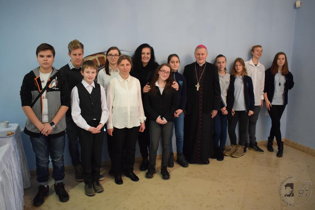 Nasza młodzież została zaproszona przez Opiekuna SKC ks. Łukasza Łukasika na spotkanie z Biskupem Grzegorzem Balcerkiem i Dyrektorem Caritasu ks. Maciejem Janeckim, aby usłyszeć słowa podziękowania za ofiarny udział w Wigilii dla najuboższych.