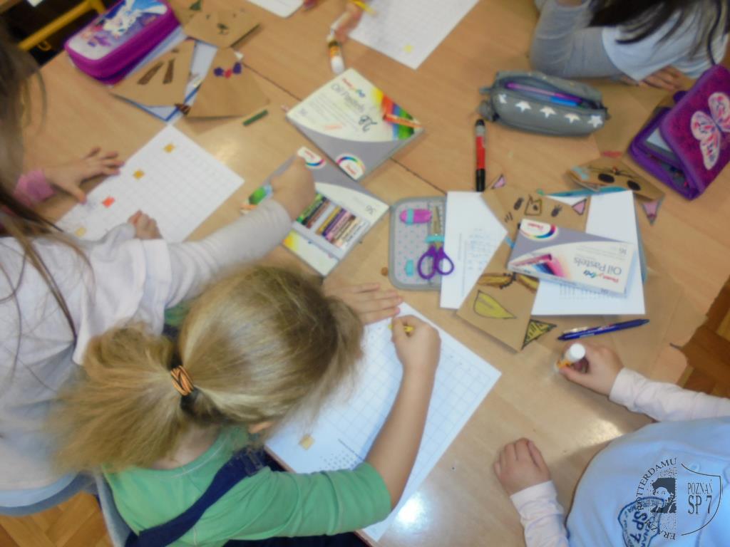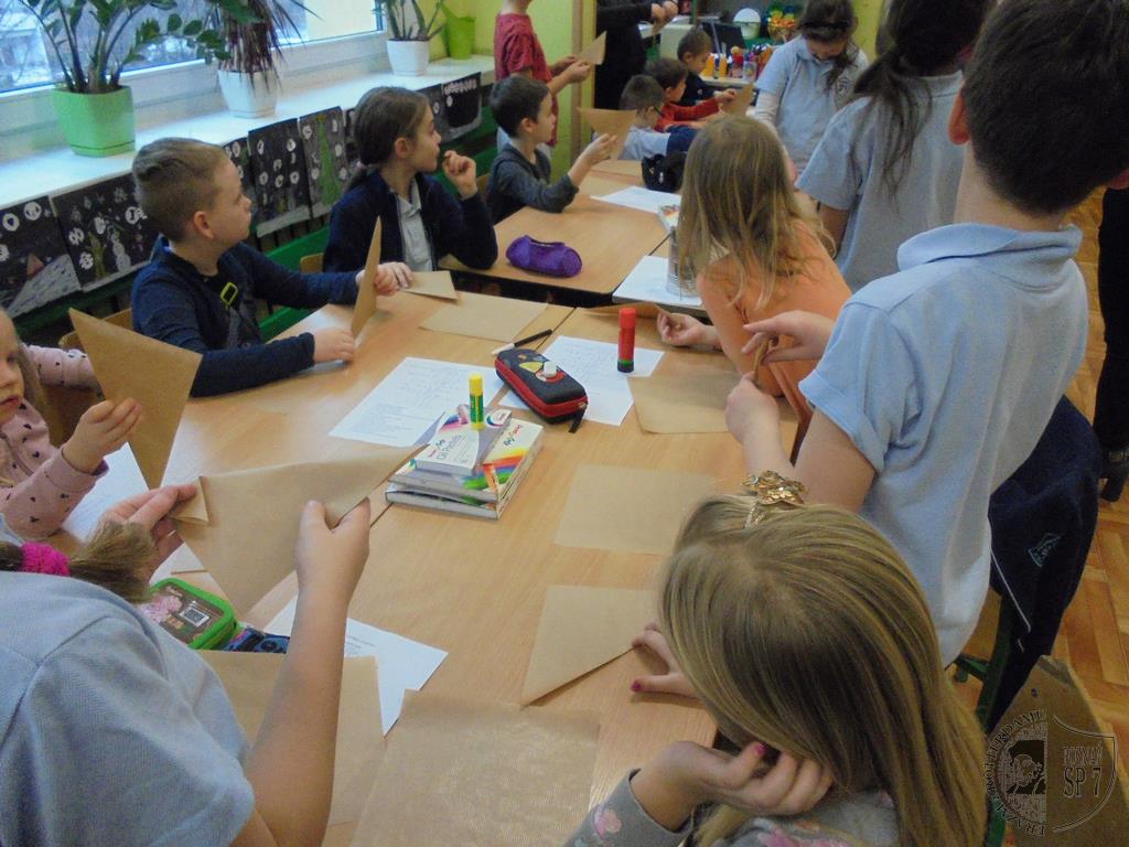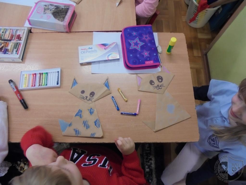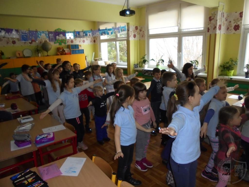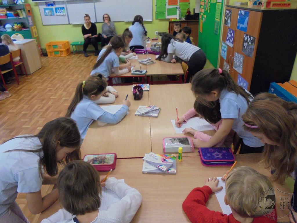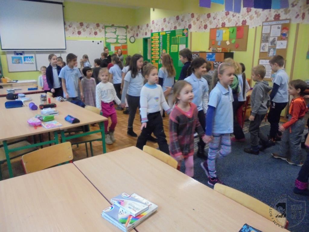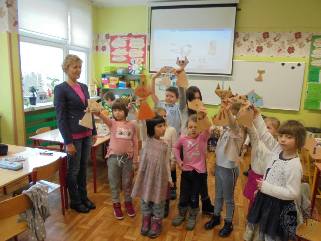 W holu Siódemki powitaliśmy zaciekawionych przedszkolaków i każdy z nas wziął jedno dziecko pod swoją opiekę. Powitaliśmy się uśmiechem i od razu zapanowała miła i przyjazna atmosfera. W naszej sali każdy przedstawił się, a potem zapytaliśmy dzieci z przedszkola, czy wiedzą czego można nauczyć się w szkole. Doskonale poradzili sobie z odpowiedzią na pytanie, więc zaprosiliśmy ich do udziału we wspólnych zajęciach. Na początek przygotowaliśmy dla nich zimowe zagadki oraz krzyżówki. Nie sprawiły one dzieciom żadnego problemu. Następnie nauczyliśmy naszych gości słów piosenki o pingwinku i wspólnie ją zaśpiewaliśmy oraz uczestniczyliśmy w zabawie ruchowej do piosenki. Kiedy już wybrzmiały ostatnie dźwięki, przenieśliśmy się wszyscy w zimowy świat kotka Szarusia, który po raz pierwszy widział śnieg. Tak nam się spodobało opowiadanie, że postanowiliśmy z pomocą naszej pani wykonać papierowego kotka. Najpierw pomogliśmy złożyć kotka naszym gościom, potem sami wykonaliśmy bohatera bajki . Dużą frajdę wszystkim sprawiło kolorowanie kotów. Kiedy już tak się bardzo napracowaliśmy, przyszła pora na rozruszanie naszych rąk i nóg. Z dużą przyjemnością nauczyliśmy przedszkolaków naszej ulubionej zabawy pt. Ręce do góry, którą razem z DJ Mikim wykonaliśmy przy dźwiękach muzyki. Na koniec spotkania pobawiliśmy się jeszcze w kodowanie i wręczyliśmy przedszkolakom uśmiechnięte buźki. To była bardzo miła wizyta.