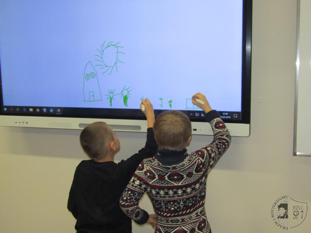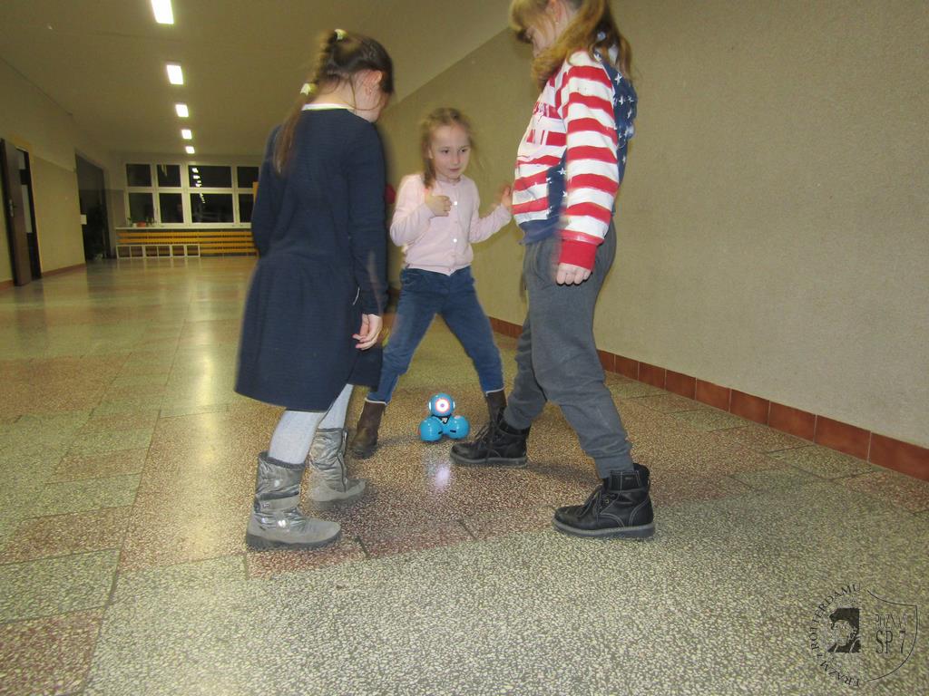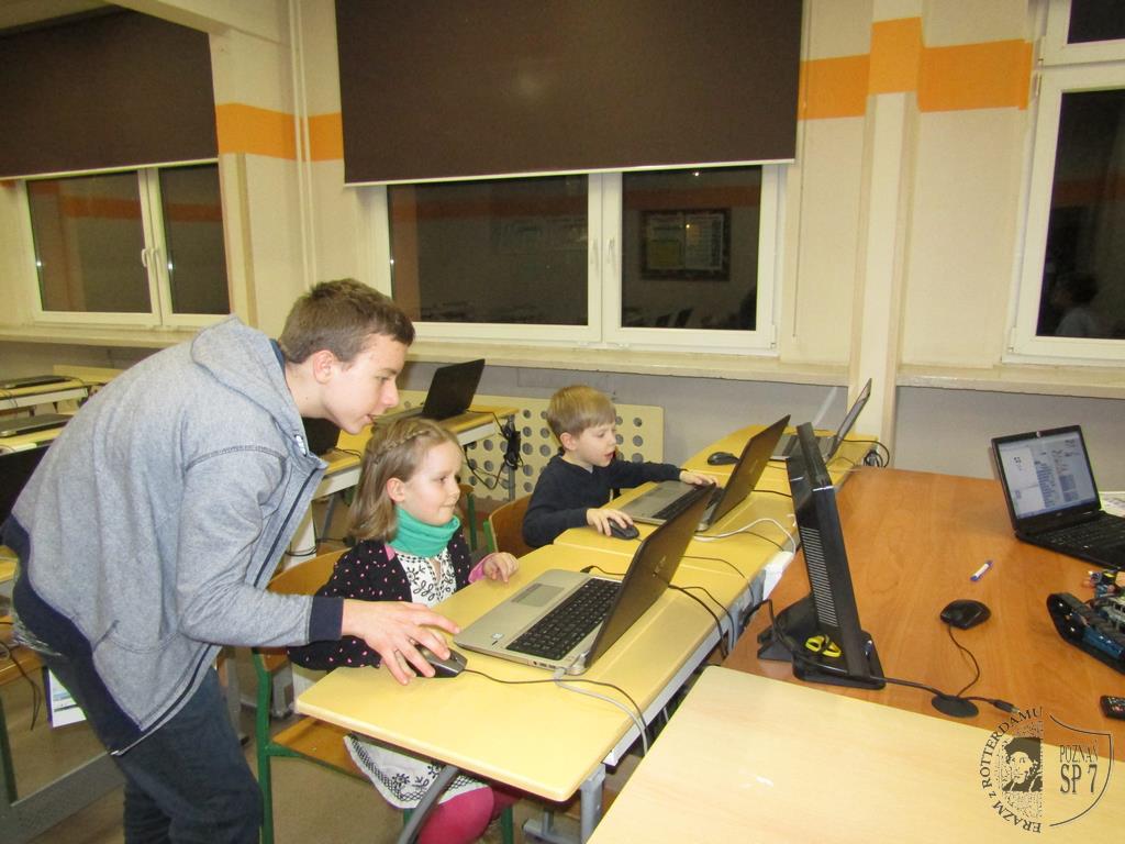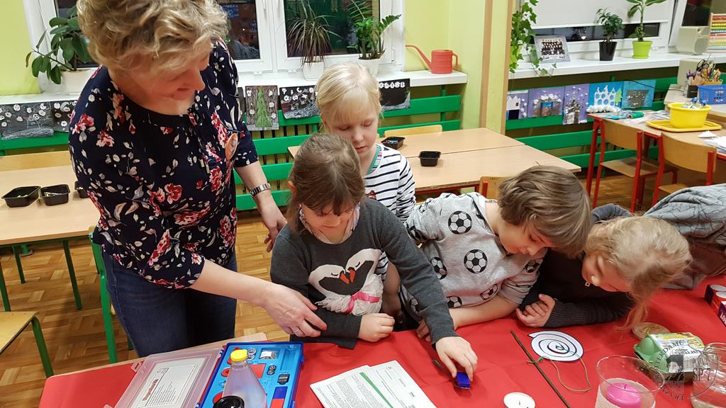 Dzieci z radością i ogromnym zapałem rozwiązywały zagadki przygotowane przez panią Kasię. Okazało się, że nie sprawiły one im najmniejszego kłopotu i przyszli uczniowie świetnie poradzili sobie z tym zadaniem. Po zdaniu szkolnego egzaminu dzieci udały się wesołym pociągiem do sal na pierwsze i drugie piętro. Tam na nich czekały różnorodne zajęcia. Dzieci uczestniczyły w zajęciach plastycznych, ruchowych, w zajęciach z wykorzystaniem tablicy interaktywnej, w eksperymentach i doświadczeniach. Grały na bum bum rurkach, wzięły udział w warsztatach teatralnych japońskiego teatru Kamishibai, poprzez zabawę uczyły się języka angielskiego. Uczestniczyły także w zajęciach komputerowych z wykorzystaniem robotów.