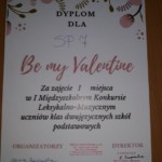 Z radością informujemy, iż uczniowie klas ósmych dwujęzycznych zajęli I miejsce w Międzyszkolnym Konkursie Muzyczno-leksykalnym pt. Be my Valentine, organizowanym przez Szkołę Podstawową nr 54 w Poznaniu. Przedmiotem konkursu było zespołowe rozwiązanie testu leksykalnego związanego z obchodami święta Świętego Walentego oraz wykonanie piosenki w języku angielskim nawiązującej do tematu „miłości”.