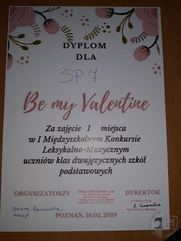Z radością informujemy, iż uczniowie klas ósmych dwujęzycznych zajęli I miejsce w Międzyszkolnym Konkursie Muzyczno-leksykalnym pt. Be my Valentine, organizowanym przez Szkołę Podstawową nr 54 w Poznaniu. Przedmiotem konkursu było zespołowe rozwiązanie testu leksykalnego związanego z obchodami święta Świętego Walentego oraz wykonanie piosenki w języku angielskim nawiązującej do tematu „miłości”.