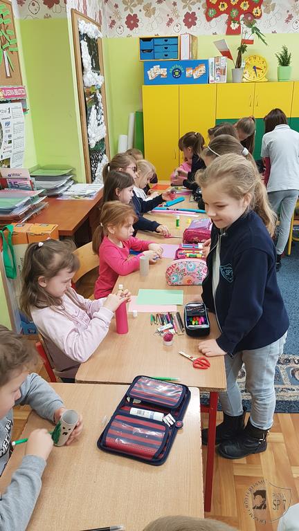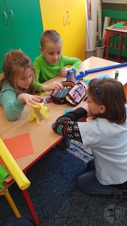 Ostatnie zadanie polegało na wykonaniu papierowego przyjaciela. Do dyspozycji dzieci miały szary rulonik oraz szereg materiałów papierniczych.