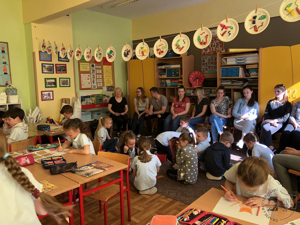 W maju mieliśmy okazję pokazać jak wygląda nasz dzień w szkole studentom III roku pedagogiki z Uniwersytetu Adama Mickiewicza w Poznaniu. Pierwsza grupa 12 studentów obserwowała naszą pracę z zaplanowanym zadaniem daltońskim oraz wykonanie pracy plastycznej w parze wg daltońskiej instrukcji. Druga grupa studentów uczestniczyła w zajęciach wychowania fizycznego połączonego z edukacją matematyczną, gdyż zadaniem uczniów oprócz szybkiego pokonania toru, czekały jeszcze zadania matematyczne, a wyniki stanowiły szyfr do otworzenia kłódek i zdobycia zwycięskiej szarfy.