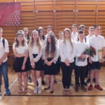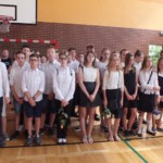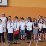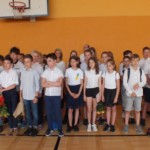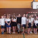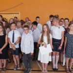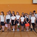 Z Panią Dyrektor i nauczycielami, w sali gimnastycznej, najpierw spotkali się uczniowie klas I-IV, a następnie V-VII. W odświętnych strojach i podniosłej atmosferze wszyscy uczestniczyli w uroczystości zakończenia roku szkolnego.