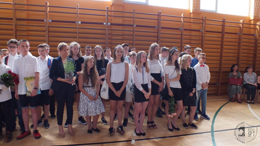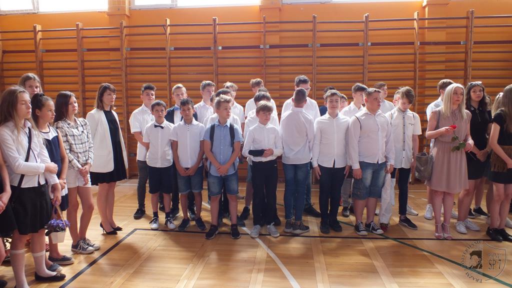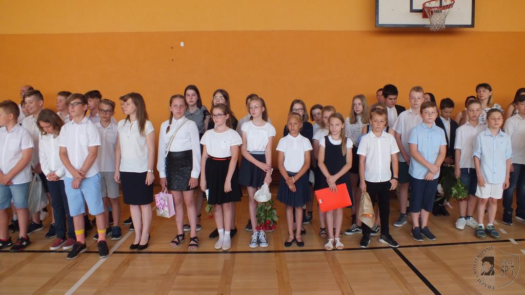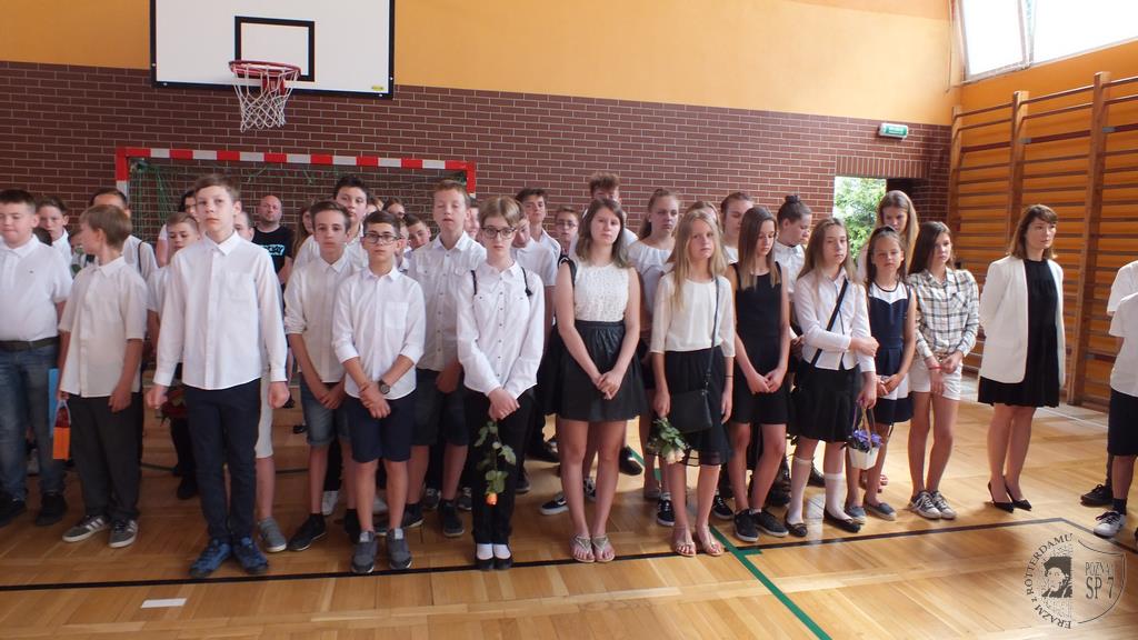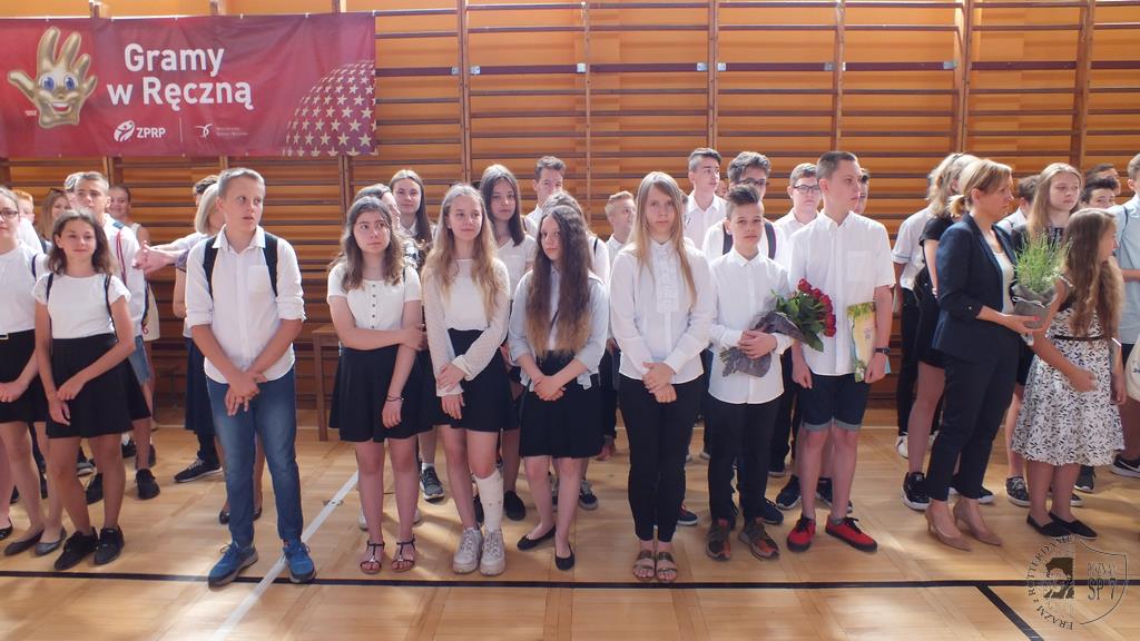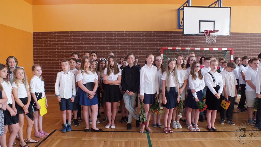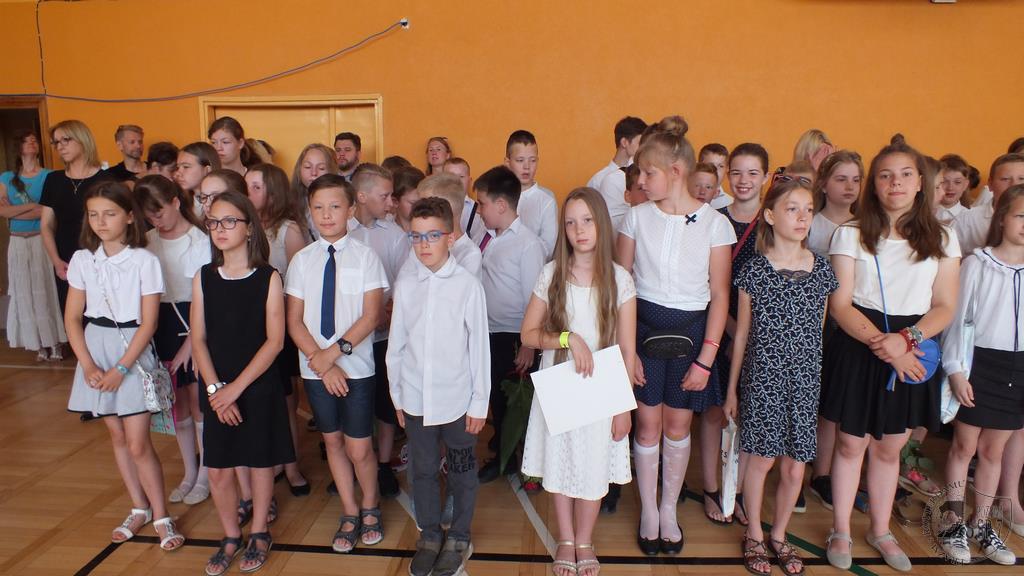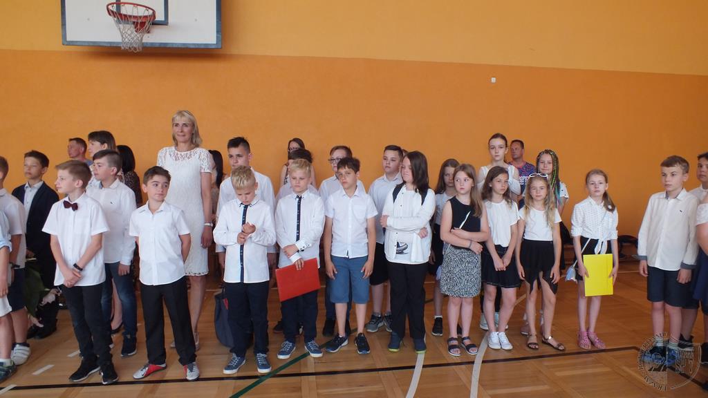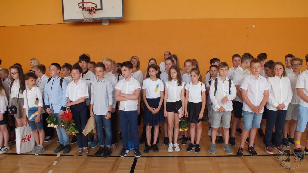 Z Panią Dyrektor i nauczycielami, w sali gimnastycznej, najpierw spotkali się uczniowie klas I-IV, a następnie V-VII. W odświętnych strojach i podniosłej atmosferze wszyscy uczestniczyli w uroczystości zakończenia roku szkolnego.