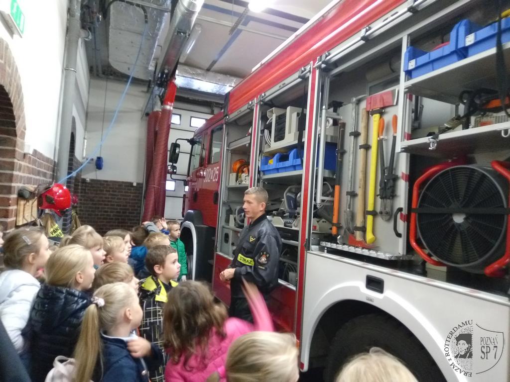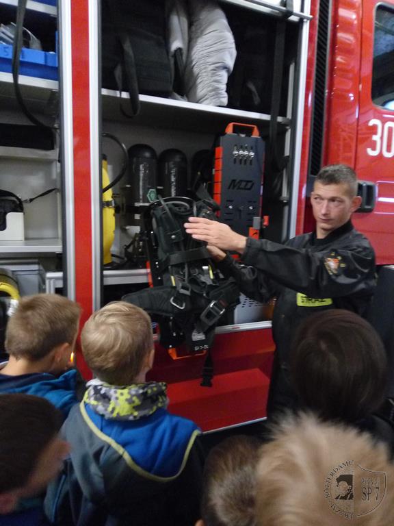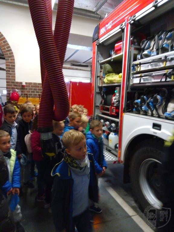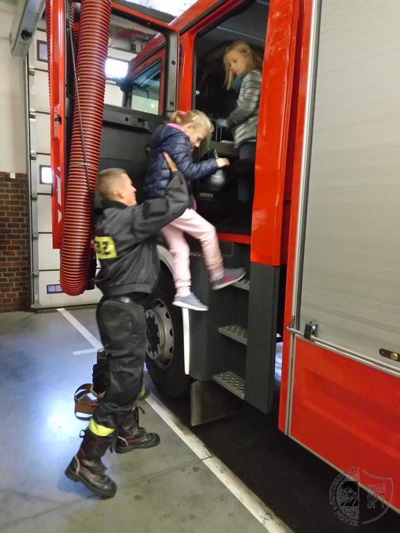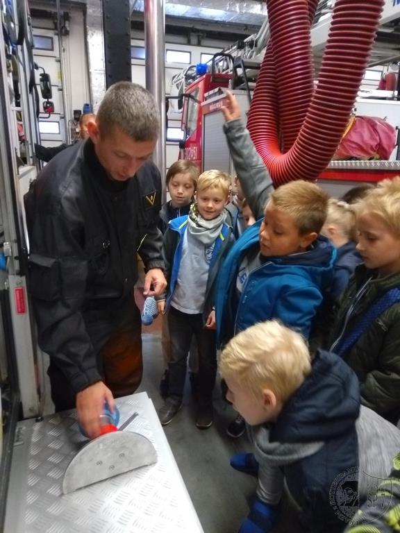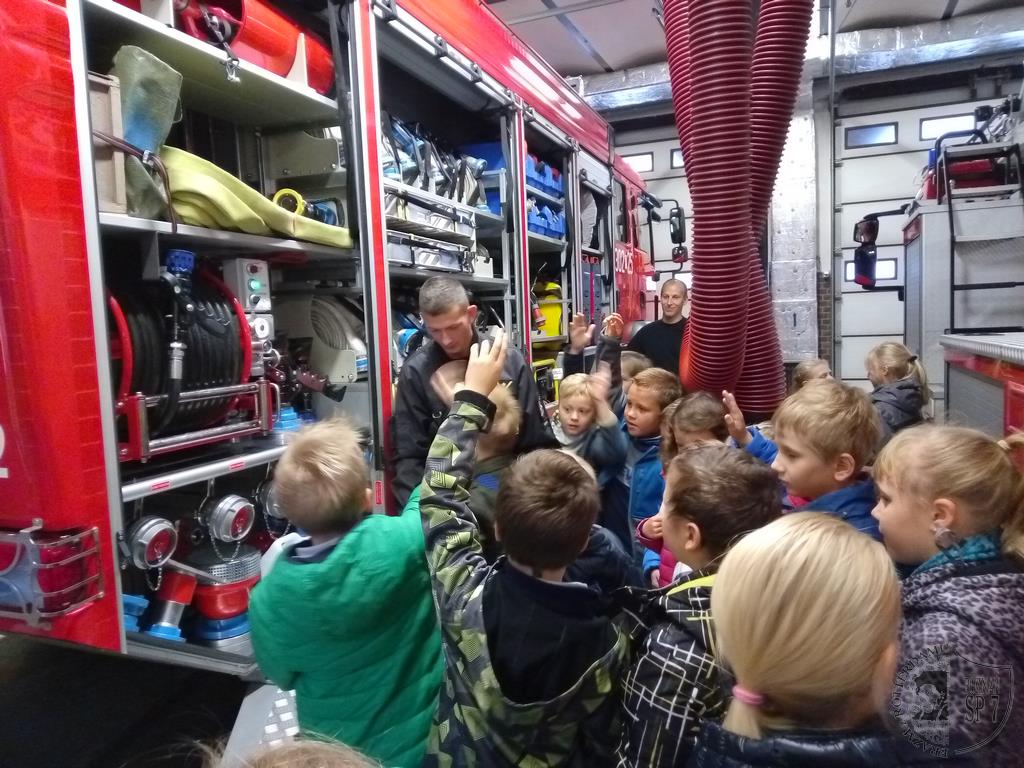 Przywitał nas pan Paweł, który oprowadził nas po jednostce, zaznajomił z charakterem bardzo ciekawej, ale i bardzo ciężkiej pracy ludzi, niosących pomoc każdemu: dużemu, małemu, a także zwierzętom, które wpadły w tarapaty. Mogliśmy z bliska zobaczyć, jak wyposażony jest każdy strażacki wóz.
