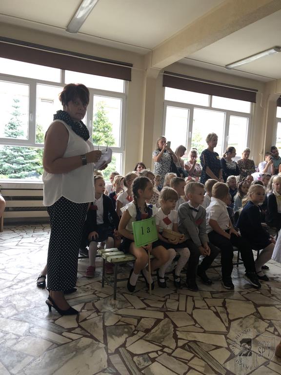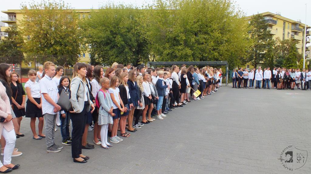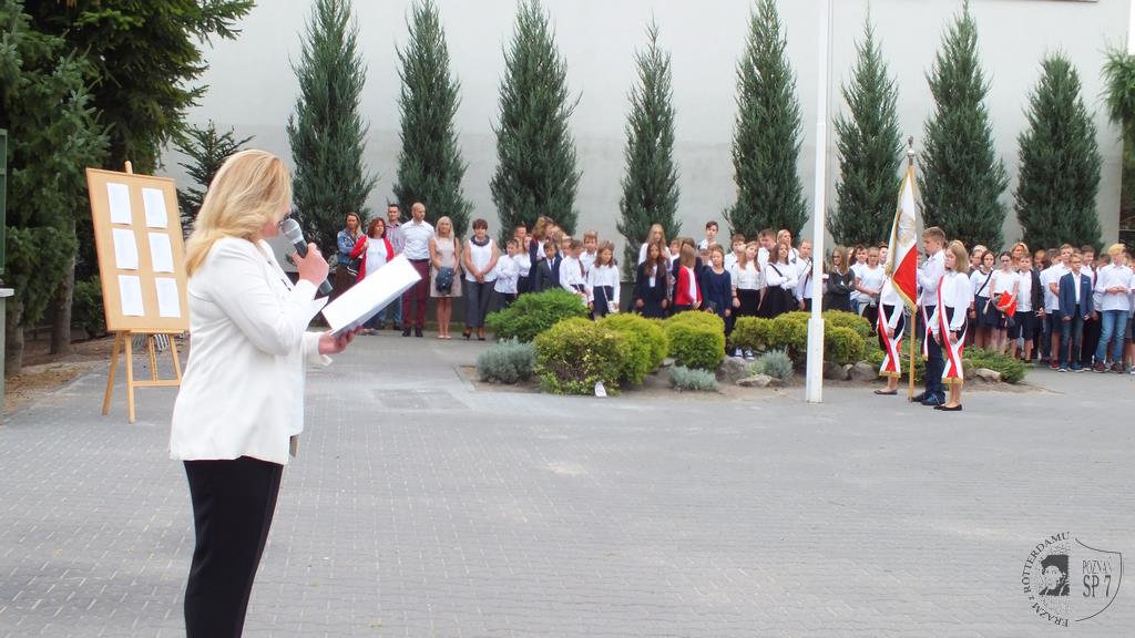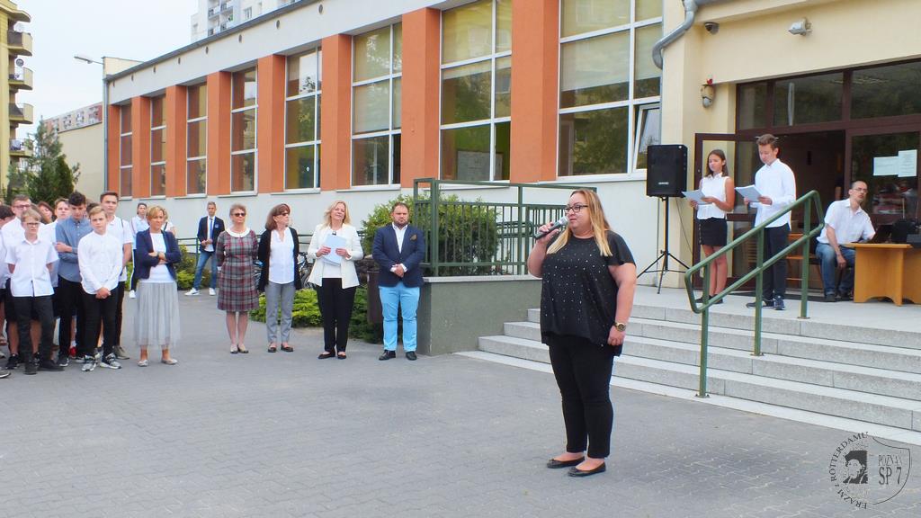 Po wprowadzeniu pocztu flagowego oraz odśpiewaniu hymnu państwowego głos zabrała Pani Dyrektor Anetta Dropińska-Pawlicka, która serdecznie powitała wszystkich uczniów, rodziców, nauczycieli oraz gości. Pani Dyrektor bardzo ucieszyła się, że wszyscy wrócili zdrowi, wypoczęci i z nowymi siłami do pracy. Poprosiła, aby uczniowie z sympatią i wyrozumiałością przywitali w swoich klasach nowe koleżanki oraz kolegów. Pani Dyrektor zaprezentowała także nazwiska nowych nauczycieli, którzy w tym roku szkolnym będą uczyć w Siódemce.