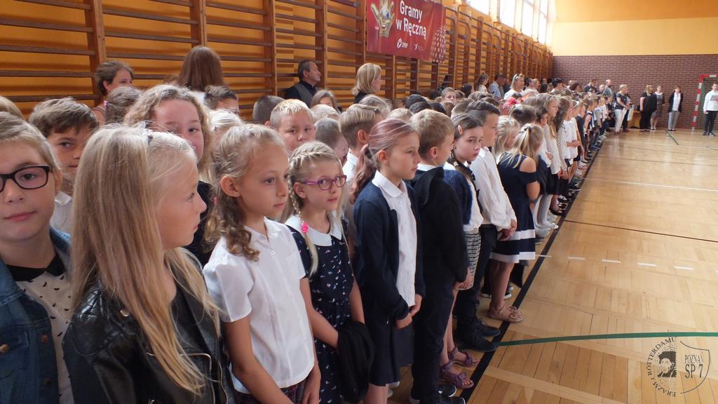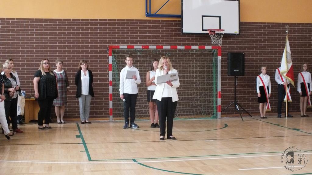 Następnie pani Dyrektor podkreśliła, że jest dumna, iż Siódemka wita swoich uczniów w nowej i odświeżonej szacie, bo Siódemkowicze zasługują na to, aby uczyć się w godnych warunkach. Ogromną w tym zasługą wykazali się goście, którzy przybyli na inaugurację Pani Małgorzata Skoniecka Pawłowska i radny miasta Poznania Pan Tomasz Stachowiak. Pani Dyrektor wskazała w swoim wystąpieniu, że nowe boisko do piłki koszykowej i odświeżone obiekty sportowe to dowód na zrozumienie potrzeb społeczności szkolnej. Nowe obiekty będą nie tylko wykorzystywane podczas lekcji wychowania fizycznego i treningów, ale także podczas swobodnych zajęć rekreacji rodzin uczniów i innych mieszkańców osiedla. Słowa podziękowań popłynęły także do wszystkich rodziców uczniów Siódemki, za inicjatywę szafkową w szkole, dofinansowanie nagród dla absolwentów i najlepszych uczniów i wiele innych pomysłów.
