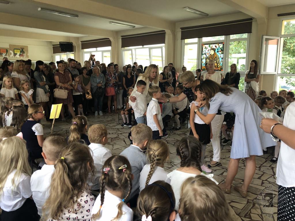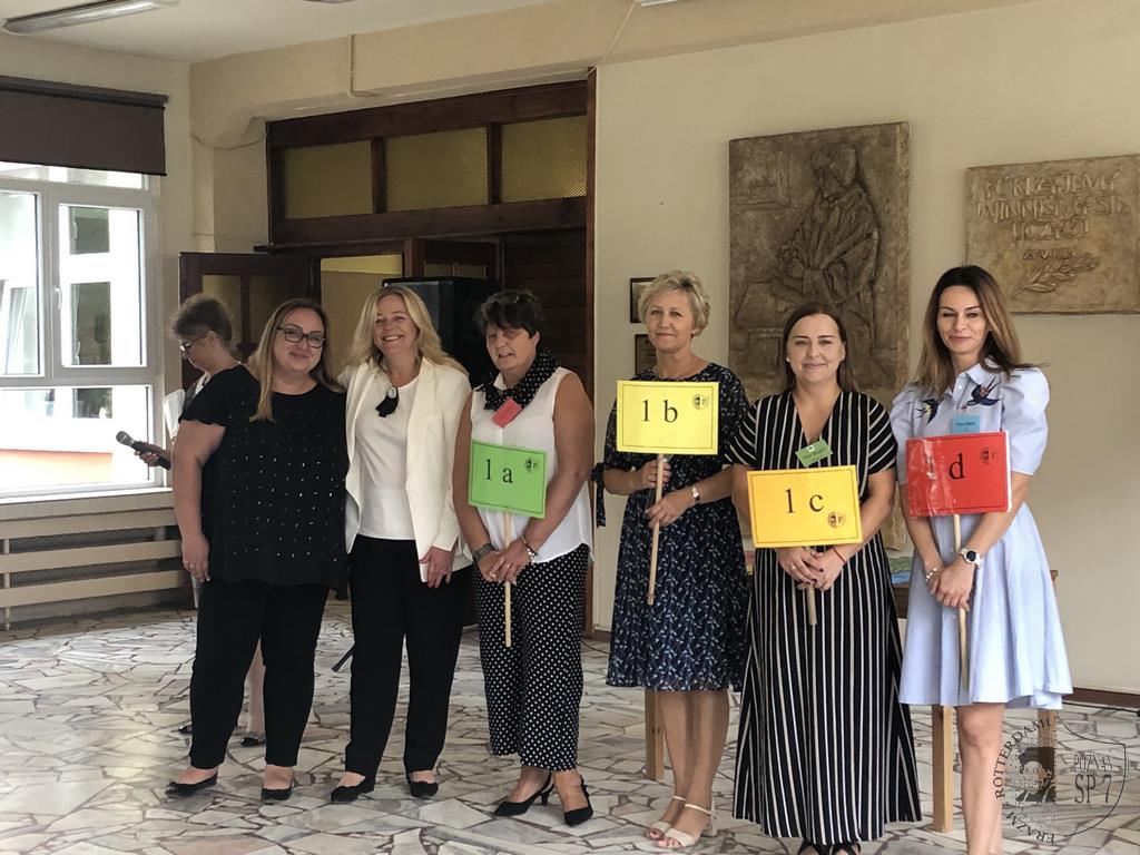 Także tego dnia przed godz. 12.00 w holu szkoły zebrali się pierwszoklasiści wraz ze swoimi rodzicami. W galowych strojach i z dziarską miną z niecierpliwością oczekiwali na informację, do której klasy pierwszej będą uczęszczać. Kiedy już wszystko stało się jasne, po odczytaniu list przez panią dyrektor Magdalenę Łagodzińską, na twarzach najmłodszych uczniów naszej szkoły zagościł uśmiech.